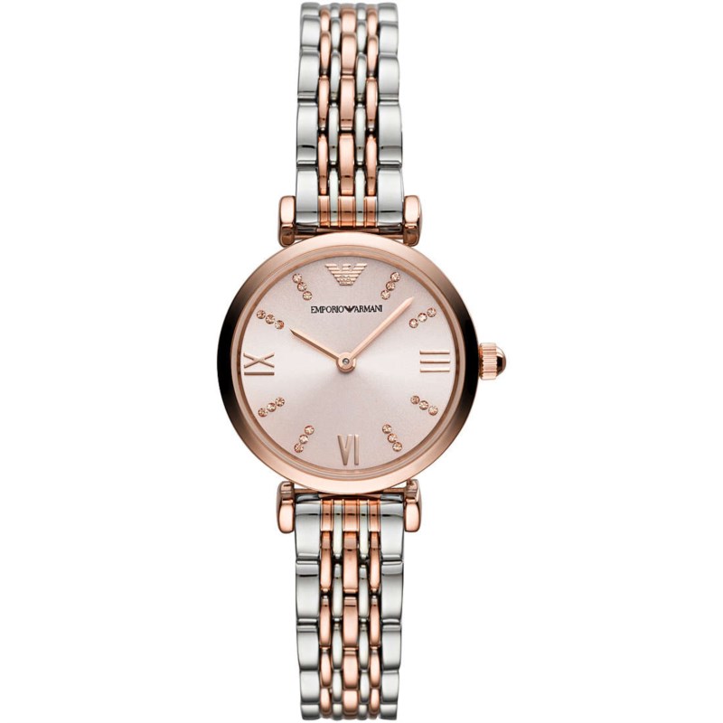 Orologio donna emporio armani, AR11223, collezione gianni t-bar; movimento al quarzo solo tempo, cassa in acciaio rosato 28 mm, quadrante rosato con finitura cristalli, bracciale in acciaio/acciaio rosato, vetro minerale, resistenza acqua 3 atm