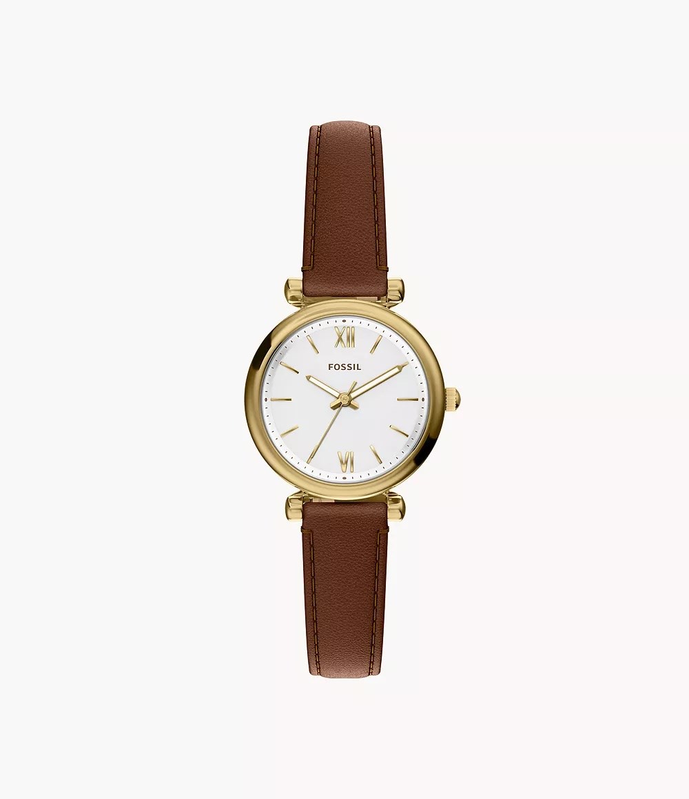 Orologio donna fossil, ES5464, collezione carlie, movimento al quarzo, solo tempo, cassa in acciaio dorato 28mm, quadrante bianco, vetro zaffiro, cinturino in pelle marrone, resistenza all'acqua 5atm,