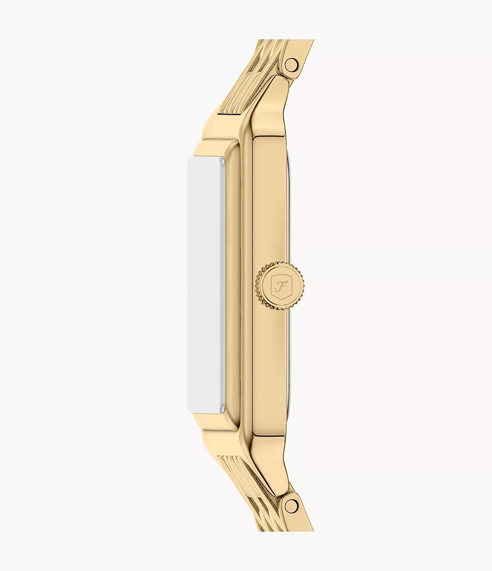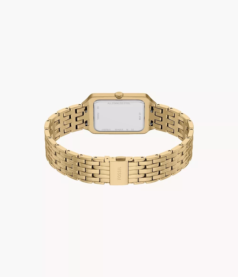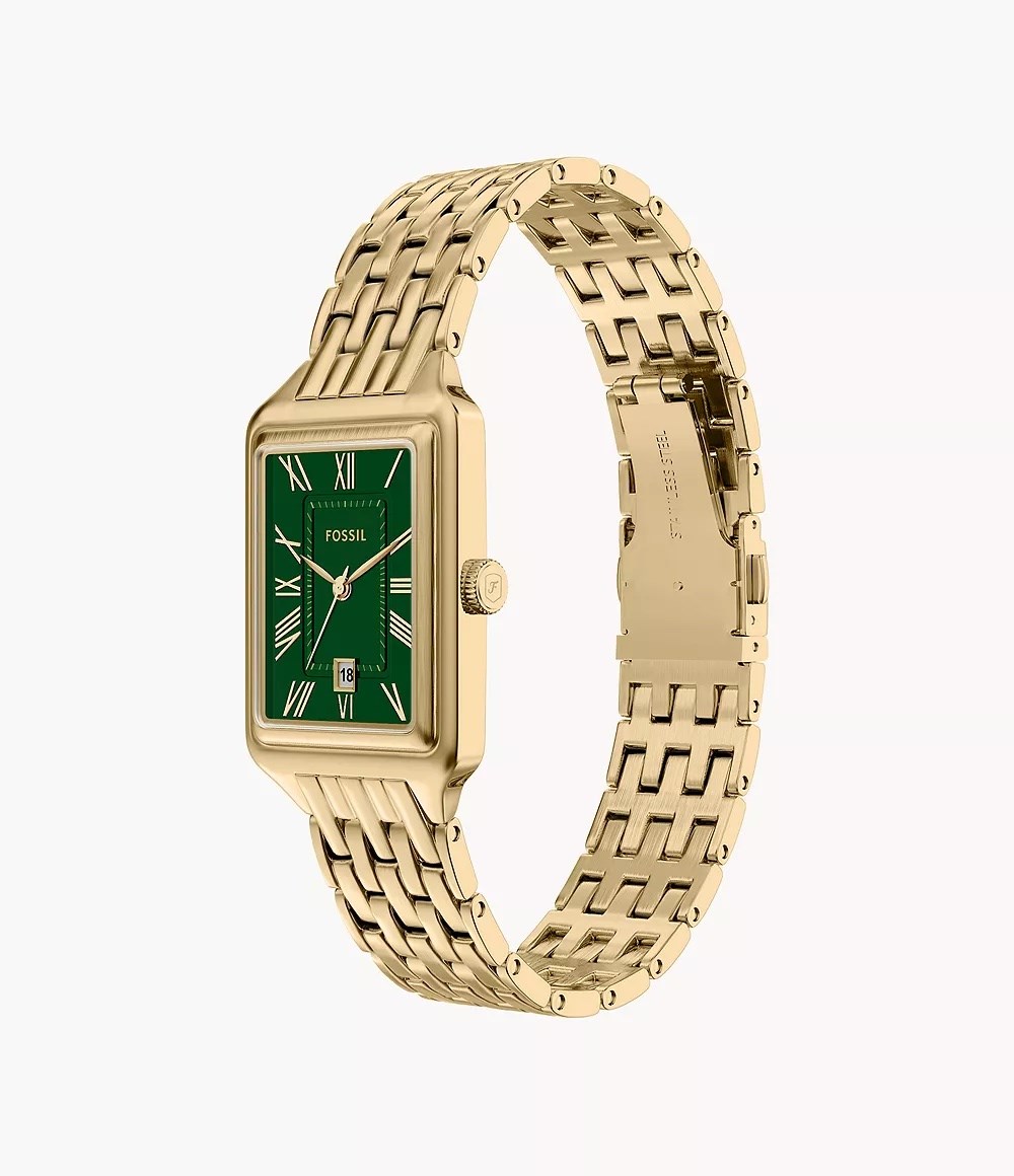 Orologio donna fossil, ES5452, collezione raquel, movimento al quarzo, solo tempo, cassa in acciaio dorato 23mm, quadrante verde con datario, bracciale in acciaio dorato, resistenza all'acqua 5atm
