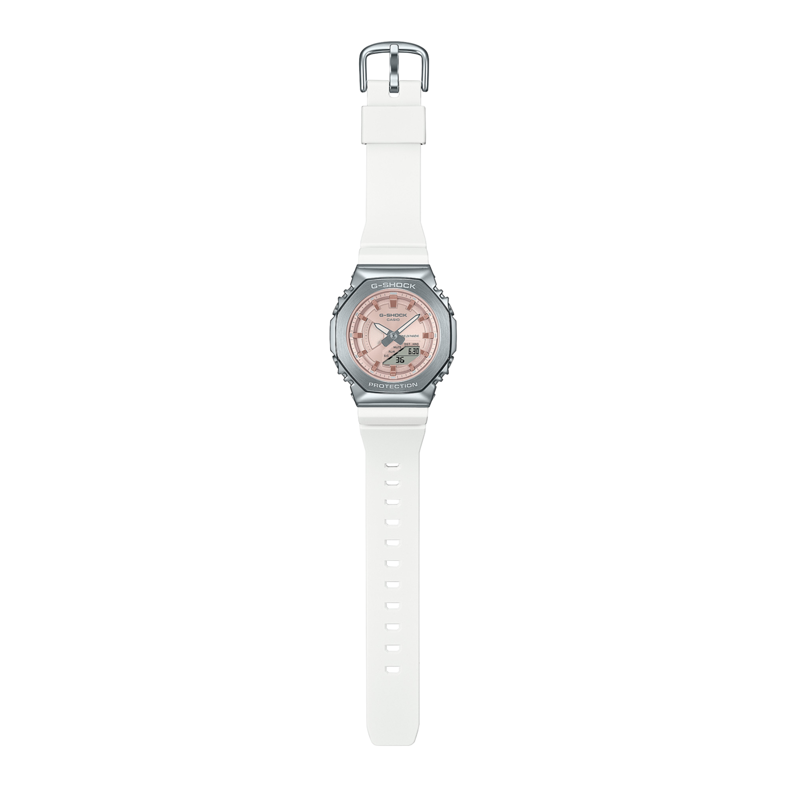 Orologio donna g-shock, GM-S2100WS-7AER, collezione g-shock classic gm-s2100, movimento al quarzo, analogico/digitale, cassa in resina 45.9 × 40.4 × 11 mm, lunetta in acciaio, cinturino in resina, resistenza all'acqua 20atm, peso 55g Resistente agli urti, Vetro minerale, Neobrite, Ora internazionale 31 fusi orari (48 città + tempo coordinato universale), visualizzazione del codice della città, visualizzazione del nome della città, attivazione/disattivazione dell'ora legale, passaggio automatico all'ora legale (DST), Cronometro, Timer, 5 promemoria sonori giornalieri, Segnale orario, Doppia luce LED per il quadrante (Super Illuminator, durata illuminazione selezionabile (1, 5 secondi o 3 secondi), luminescenza), Retroilluminazione LED per il display digitale (Super Illuminator, durata illuminazione selezionabile (1, 5 secondi o 3 secondi), luminescenza), luce led bianco, Calendario automatico completo (fino all'anno 2099), Attivazione/disattivazione del segnale acustico di pressione pulsanti, Precisione: ±15 secondi al mese, Formato 12/24 ore, Funzione di spostamento delle lancette (le lancette si spostano per non bloccare la visualizzazione del contenuto del display digitale), Indicazione dell'ora regolare: Analogico: 2 lancette (ora, minuto (la lancetta si muove ogni 20 secondi)), Digitale: ora, minuto, secondo, pm, mese, data, giorno del mese
