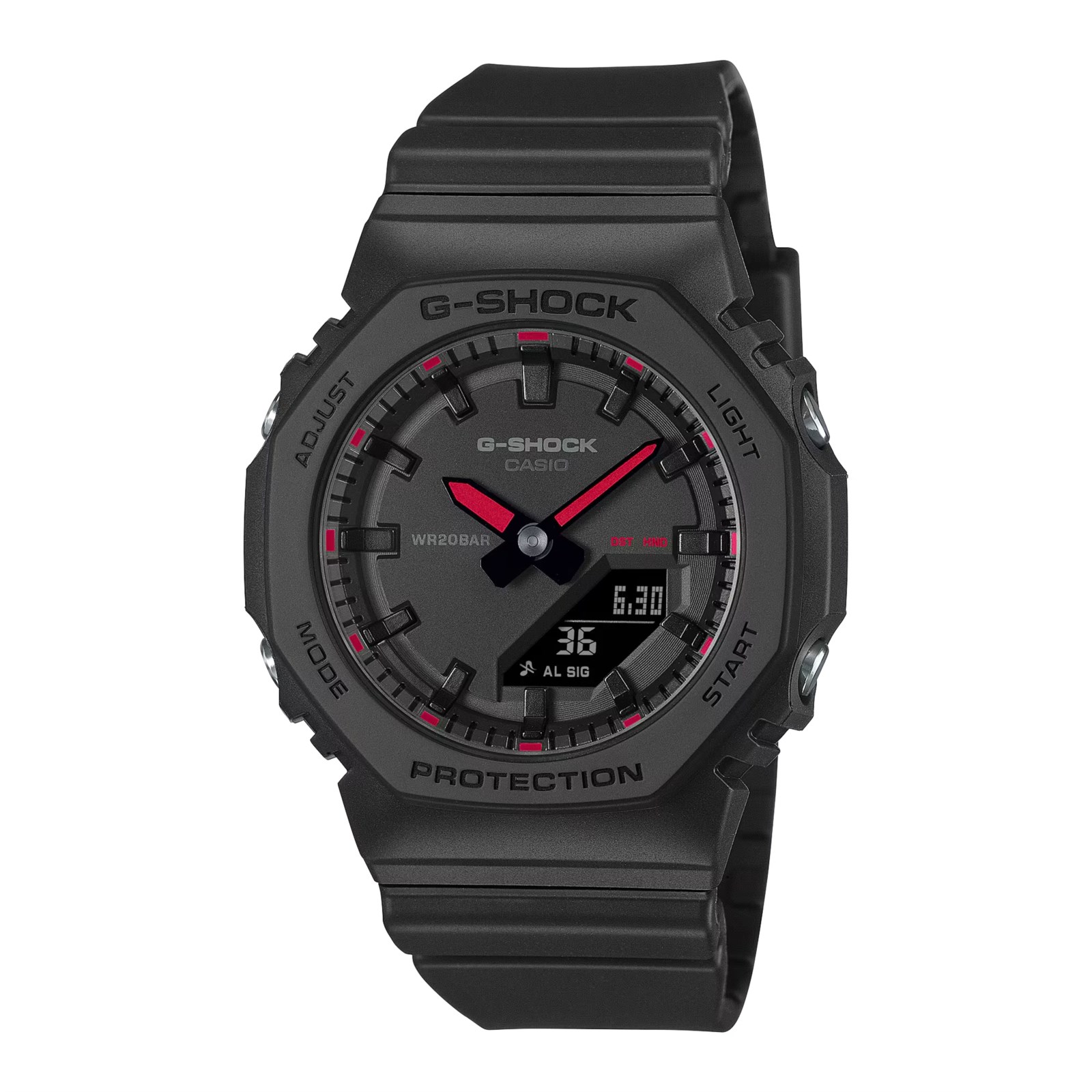 Orologio donna g-shock, GMA-P2100SA-1A1ER, collezione g-shock gma-p2100, movimento al quarzo, analogico/digitale, cassa in resina a base biologica 46 × 40.2 × 11.2 mm, lunetta in resina a base biologica, cinturino in resina a base biologica, resistenza all'acqua 20 bar Resistente agli urti, Vetro minerale, neobrite, Ora internazionale 31 fusi orari (48 città + tempo coordinato universale), attivazione/disattivazione dell'ora legale, cronometro, timer, 5 promemoria sonori giornalieri, segnale orario, Doppia luce LED Luce LED per il quadrante (Super Illuminator, durata illuminazione selezionabile (1, 5 secondi o 3 secondi), luminescenza), Retroilluminazione a LED per il display digitale (Super Illuminator, durata illuminazione selezionabile (1, 5 secondi o 3 secondi), luminescenza), luce led bianco, Calendario automatico completo (fino all'anno 2099), Attivazione/disattivazione del segnale acustico di pressione pulsanti, Precisione: ±15 secondi al mese, Funzione di spostamento delle lancette (le lancette si spostano per non bloccare la visualizzazione del contenuto del display digitale), Indicazione dell'ora regolare: Analogico: 2 lancette (ora, minuto (la lancetta si muove ogni 20 secondi)), Digitale: ora, minuto, secondo, pm, mese, data, giorno del mese