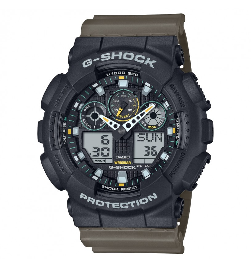 Orologio uomo G-shock, GA-100TU-1A3ER, collezione GA-100TU, Cassa antiurto e antimagnetica in resina nera opaca dalle dimensioni di 55 mm x 51, 2 mm e spessore di 16, 9 mm. Cinturino in resina marrone; chiusura con fibbia ardiglione. Quadrante analogico digitale con illuminazione LED automatica: basta infatti ruotare leggermente il polso per illuminare il display.