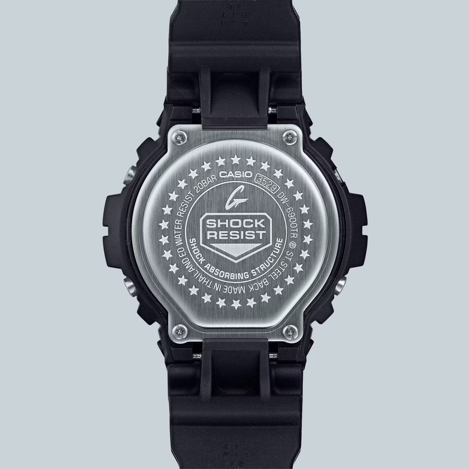 Orologio uomo g-shock, DW-6900TR-1ER, collezione serie dw-6900, movimento al quarzo, digitale, cassa in resina a base biologica 53.2 × 50 × 18.7 mm, lunetta in resina a base biologica, cinturino in resina a base biologica, resistenza all'acqua 20 bar Resistente agli urti, Vetro minerale, Cronometro, Timer, Promemoria sonoro /Segnale orario, Avviso con luce lampeggiante Lampeggia con un segnale acustico per promemoria sonori, segnali orari, segnale acustico di fine timer conto alla rovescia, Retroilluminazione LED (Super Illuminator), Luminescenza, luce led bianco, Calendario automatico completo (fino all'anno 2099), Precisione: ±15 secondi al mese, Indicazione dell'ora regolare: ora, minuto, secondo, pm, mese, data, giorno del mese