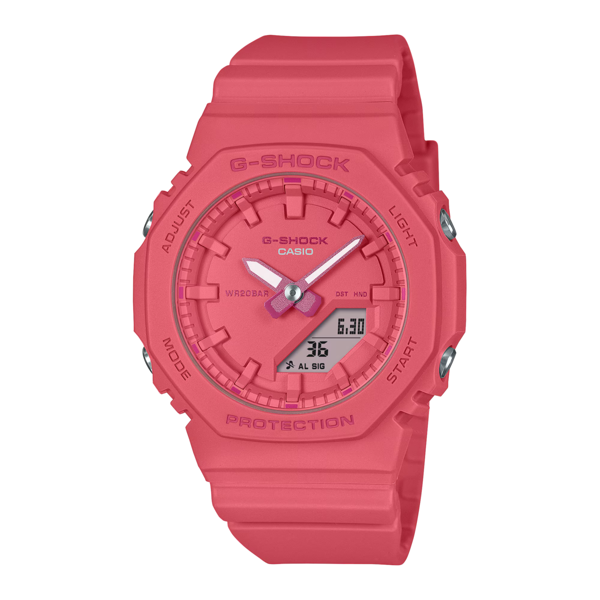 Orologio donna g-shock, GMA-P2100-4AER, collezione serie gma-p2100, movimento al quarzo, analogico/digitale, cassa in resina a base biologica 46 × 40.2 × 11.2 mm, lunetta in resina a base biologica, cinturino in resina a base biologica, resistenza all'acqua 20atm, peso 40g Resistente agli urti, Vetro minerale, neobrite, Ora internazionale 31 fusi orari (48 città + tempo coordinato universale), attivazione/disattivazione dell'ora legale, Cronometro, Timer, 5 promemoria sonori giornalieri, Segnale orario, Doppia luce LED per il quadrante (Super Illuminator, durata illuminazione selezionabile (1, 5 secondi o 3 secondi), luminescenza) Retroilluminazione LED per il display digitale (Super Illuminator, durata illuminazione selezionabile (1, 5 secondi o 3 secondi), luminescenza), luce led bianco, Calendario automatico completo (fino all'anno 2099), Attivazione/disattivazione del segnale acustico di pressione pulsanti, Precisione: ±15 secondi al mese, Formato 12/24 ore Funzione di spostamento delle lancette (le lancette si spostano per non bloccare la visualizzazione del contenuto del display digitale), Indicazione dell'ora regolare: Analogico: 2 lancette (ora, minuto (la lancetta si muove ogni 20 secondi), Digitale: ora, minuto, secondo, pm, mese, data, giorno del mese