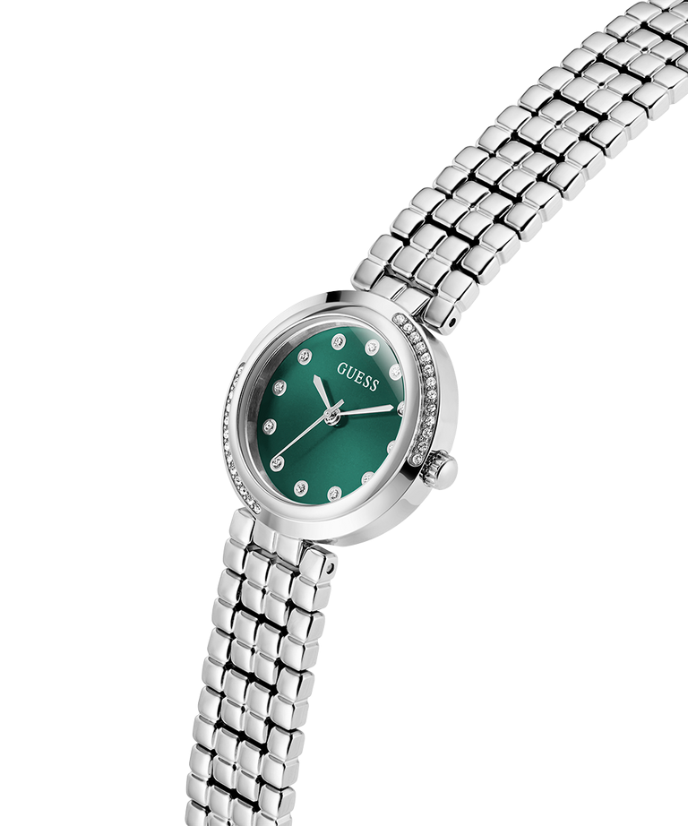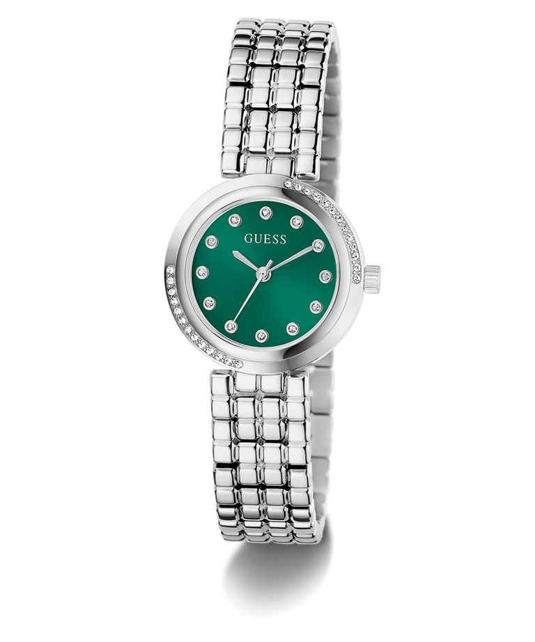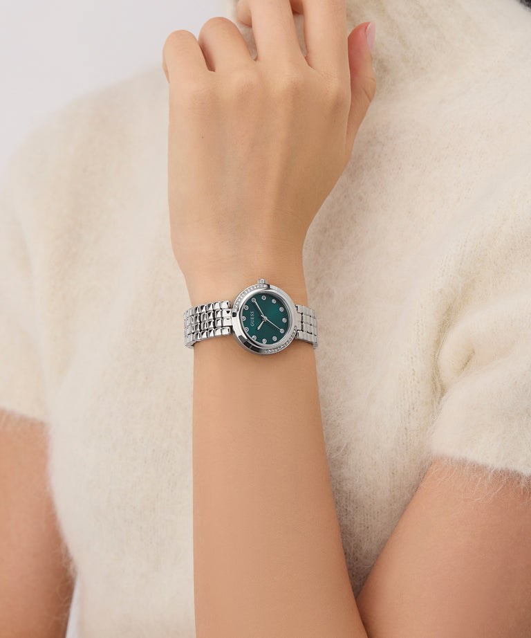 Orologio donna guess, GW0930L1, collezione clara, movimento al quarzo, solo tempo, cassa in acciaio 28mm, quadrante verde, bracciale in acciaio, resistenza all'acqua 3atm