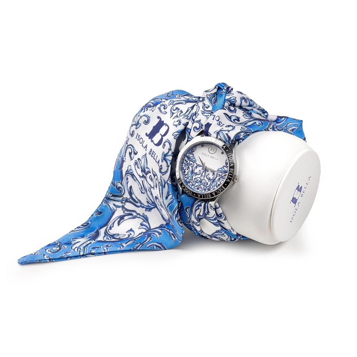 Orologio donna isola bella, 40000128, collezione onda decoro, movimento al quarzo, solo tempo con cassa in acciaio 36mm e quadrante con motivi ispirati alle maioliche di Caltagirone e zirconi, cinturino intercambiabile in pelle o foulard. resistente all'acqua 5atm.