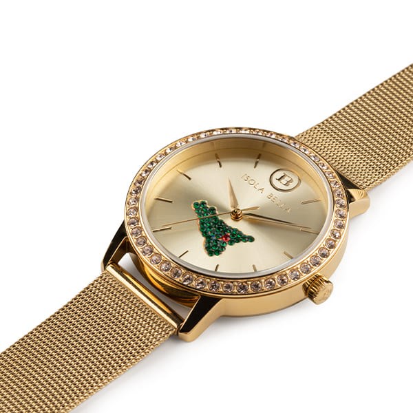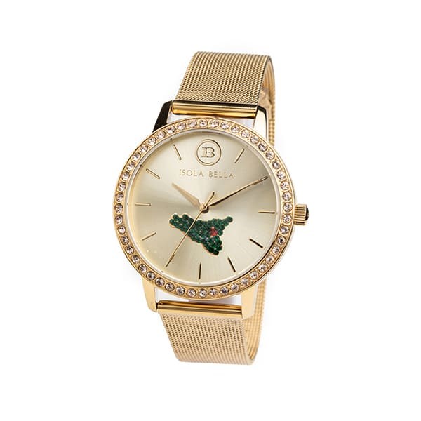 Orologio donna isola bella, 40000072, collezione orologio, movimento al quarzo, solo tempo, cassa in acciaio dorato 38mm, quadrante dorato con mini sicilia e pietre, cinturino in maglia milano dorato, resistenza all'acqua 5atm Chi porta la Sicilia nel cuore può indossarla in ogni momento: un orologio luminoso dai riflessi dorati fa da sfondo a una piccola isola verde, posizionata al centro del quadrante.
