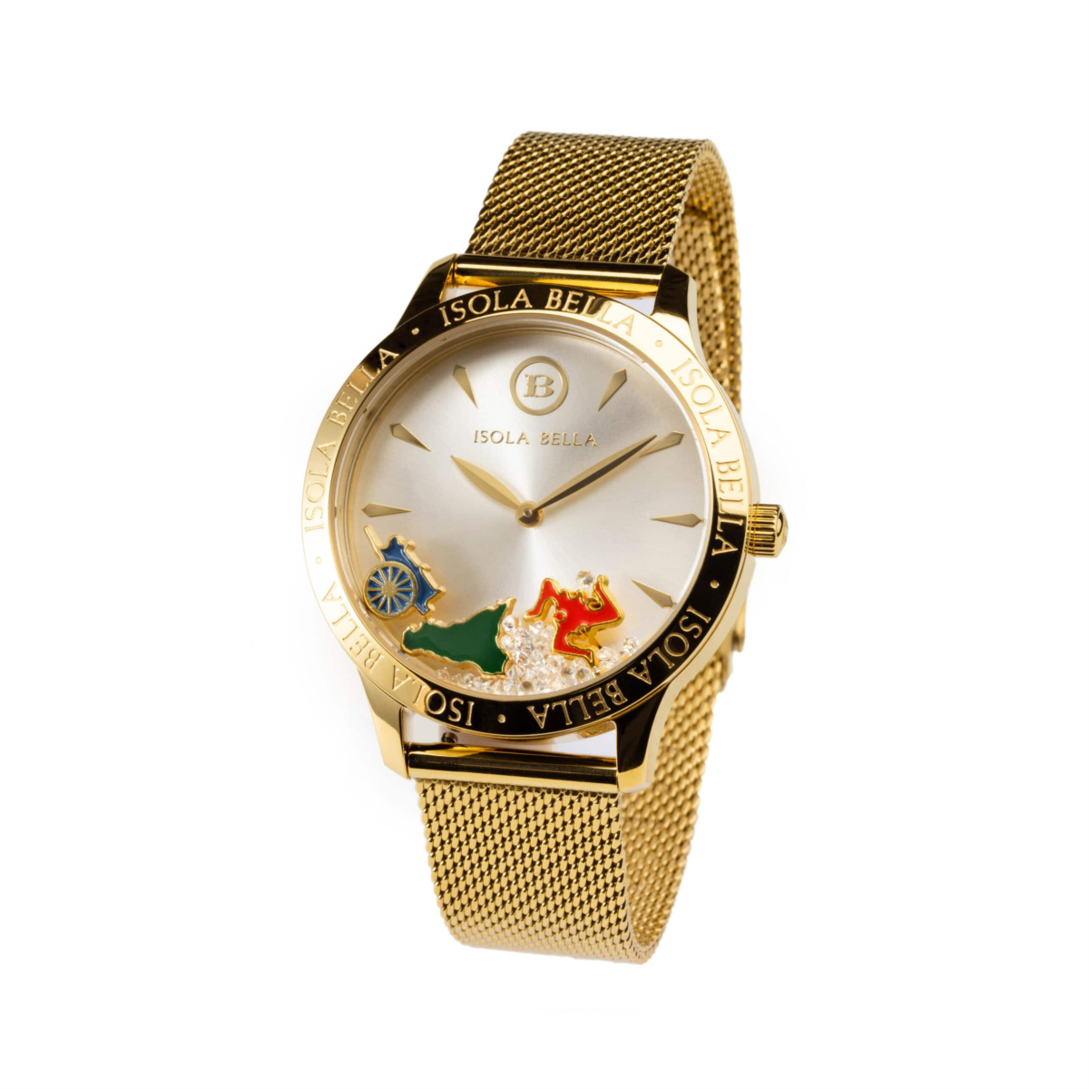 Orologio donna isola bella, 40000095, collezione orologio, movimento al quarzo, solo tempo, cassa in acciaio dorato 38mm, quadrante decorato con charms e pietre, cinturino in maglia milano dorato, resistenza all'acqua 5atm Delicati charms dal tema siciliano si muovono sinuosi in questo originale orologio