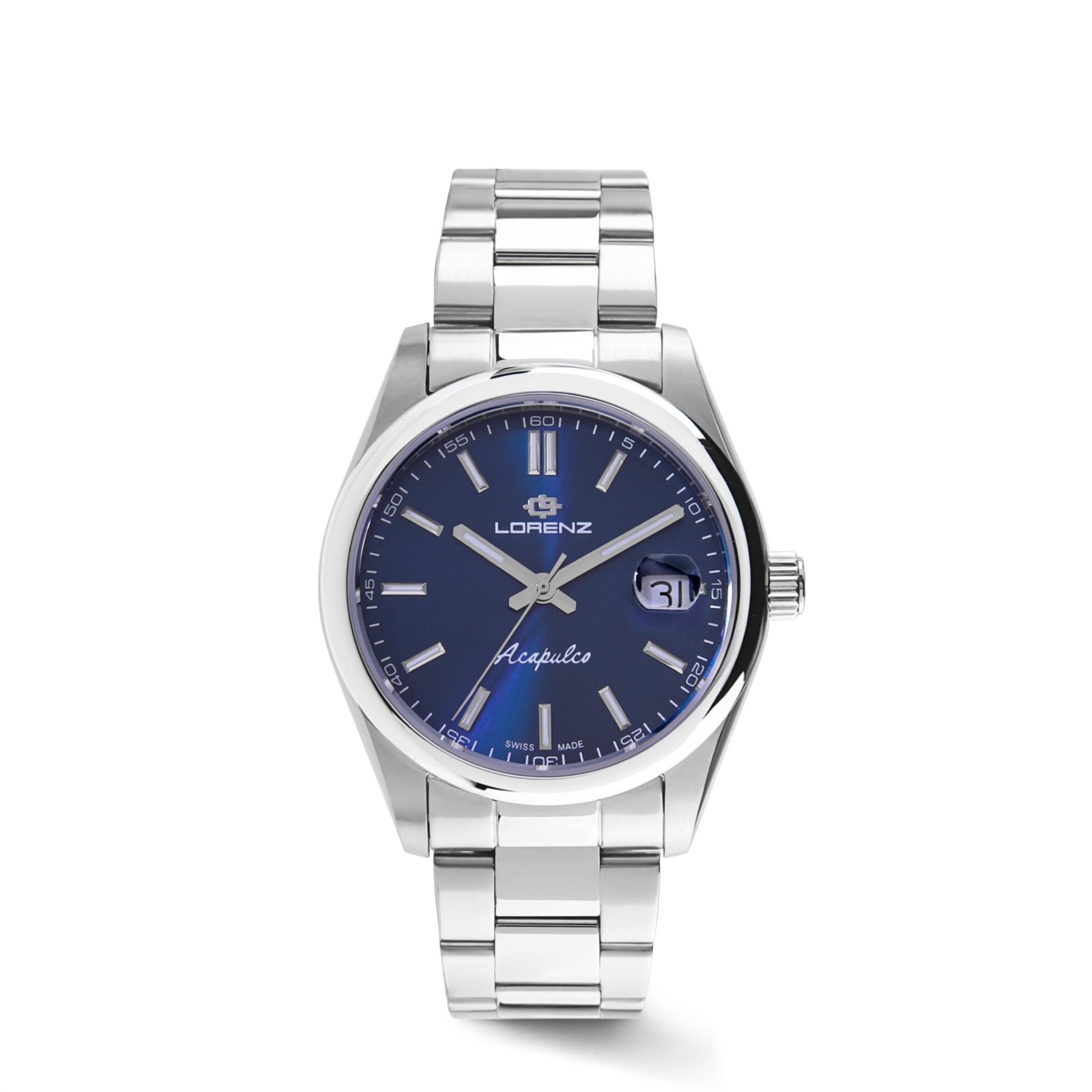 Orologio uomo lorenz, 090021BB, collezione acapulco, movimento al quarzo, solo tempo, cassa in acciaio 39mm, quadrante blu con datario a bolla, bracciale in acciaio, resistenza all'acqua 10atm