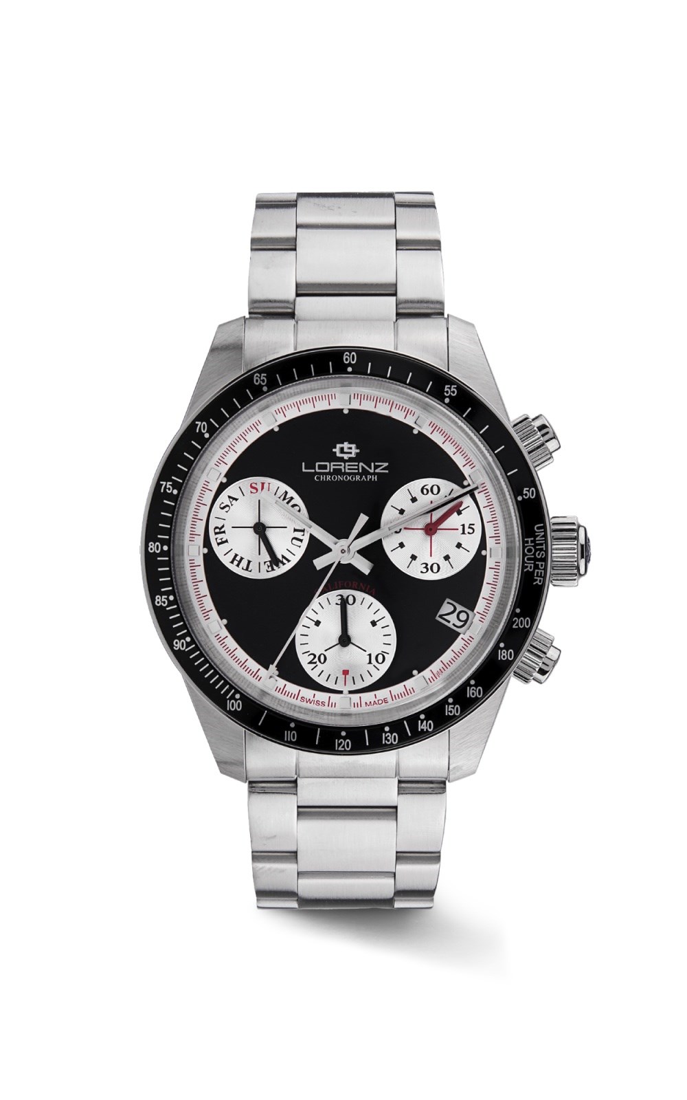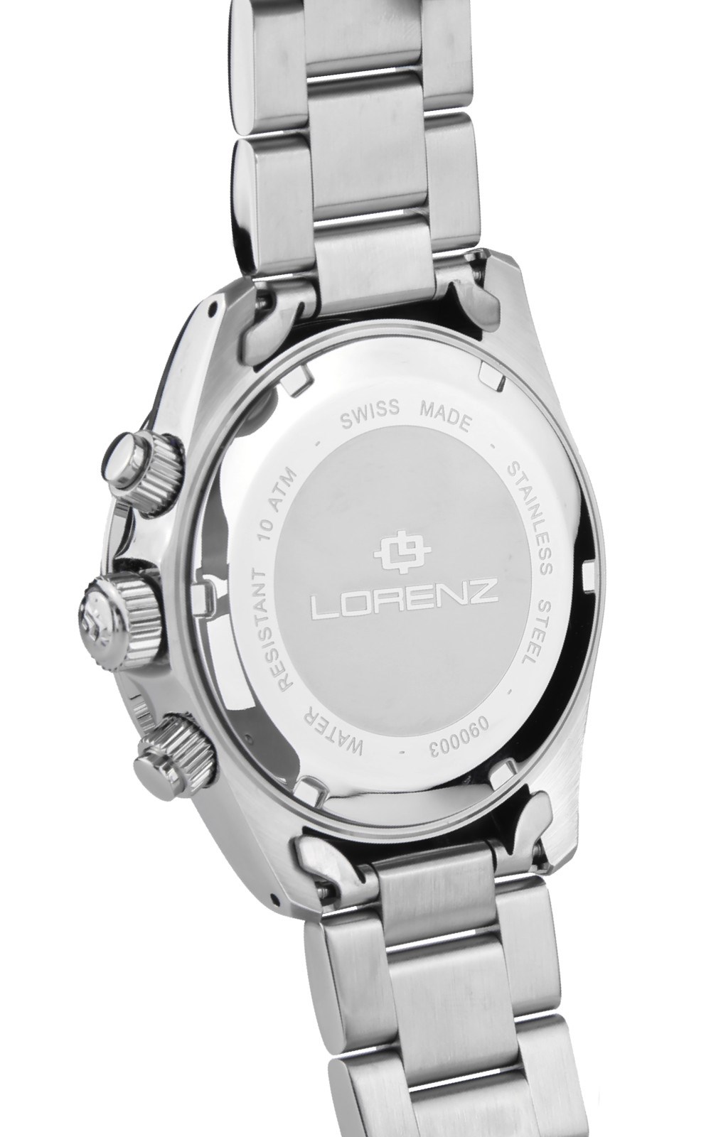 Orologio uomo lorenz, 090003AA, collezione california, movimento al quarzo, cronografo, cassa in acciaio 40mm, quadrante nero con datario, Vetro K1 box bombato, lunetta in alluminio con scala tachimetrica, Fondello a vite, corona a pressione, bracciale in acciaio, resistenza all'acqua 10atm