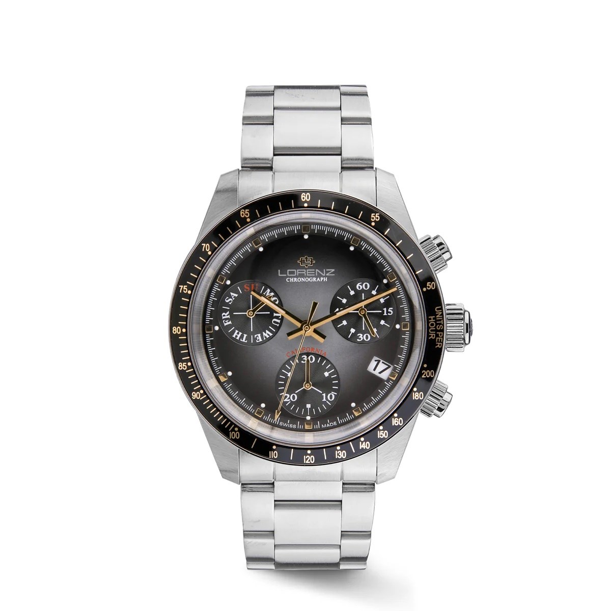 Orologio uomo lorenz, 090003GG, collezione california, movimento al quarzo, cronografo, cassa in acciaio 40mm, quadrante nero con datario, bracciale in acciaio, resistenza all'acqua 10 atm