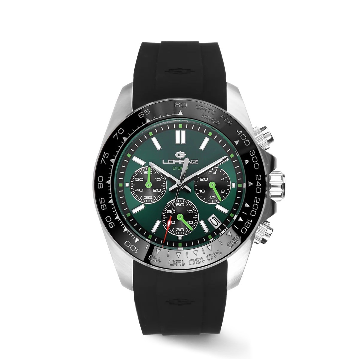 Orologio uomo lorenz, 030274EE, collezione di300, movimento al quarzo, cronografo, cassa in acciaio 42mm, quadrante verde con datario, cinturino in gomma, resistenza all'acqua 30atm