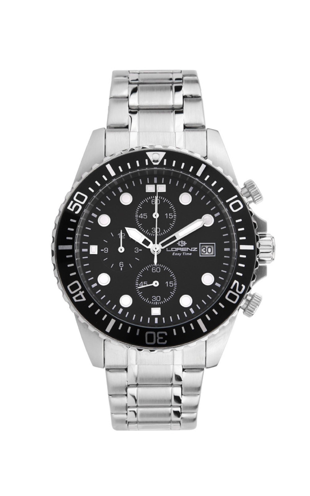 Orologio uomo lorenz, 030244AA, collezione easy time, movimento al quarzo, cronografo, cassa in acciaio 41mm, quadrante nero con datario, Lunetta girevole unidirezionale coi tempi di immersione, Corona e fondo a vite; Vetro minerale, bracciale in acciaio, resistenza all'acqua 10atm