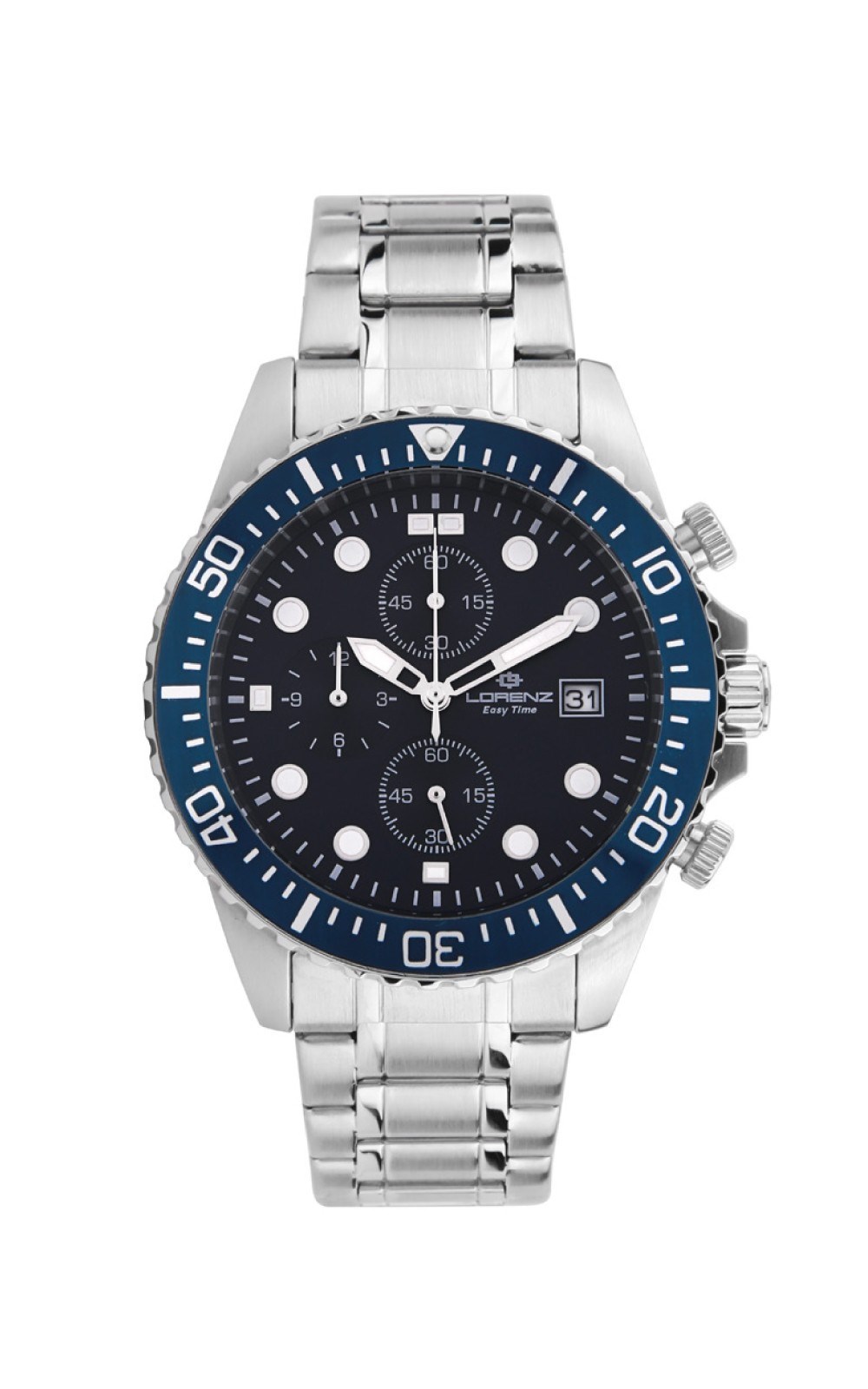 Orologio uomo lorenz, 030244BB, collezione easy time, movimento al quarzo, cronografo, cassa in acciaio 41mm, quadrante blu con datario, Lunetta girevole unidirezionale coi tempi di immersione, corona e fondo a vite, vetro minerale, bracciale in acciaio, resistenza all'acqua 10atm