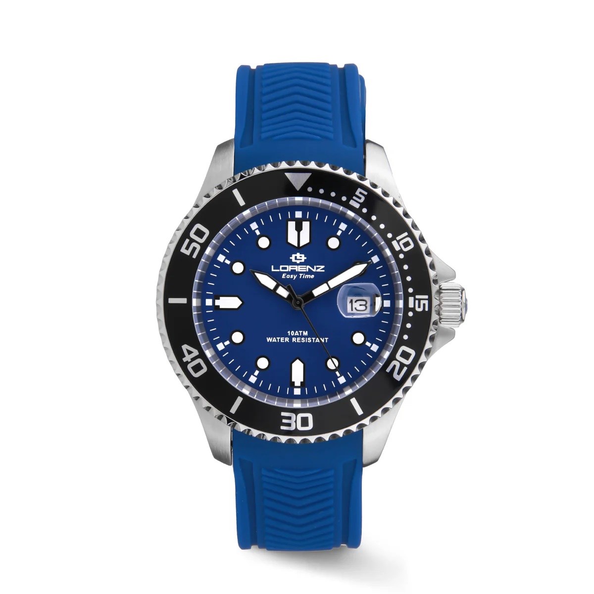 Orologio uomo lorenz, 030263FF, collezione easy time, movimento al quarzo, solo tempo, cassa in acciaio 43mm, quadrante blu con datario a bolla, cinturino in gomma, resistenza all'acqua 10atm