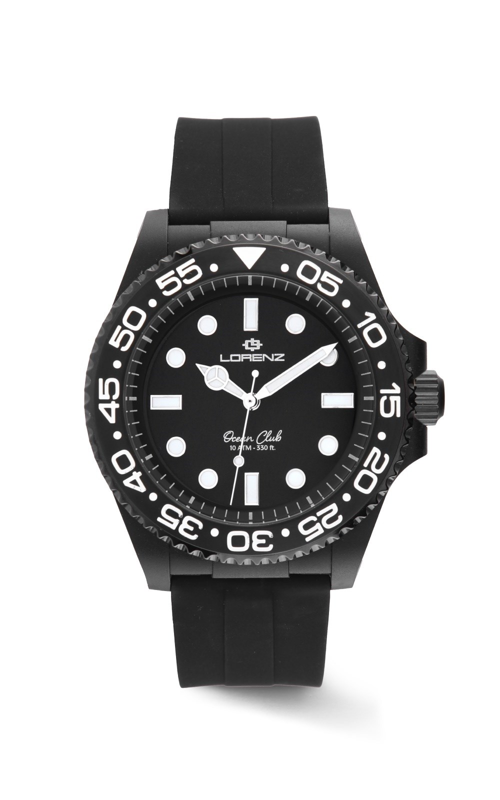 Orologio uomo lorenz, 030268AA, collezione ocean club, movimento al quarzo, solo tempo, cassa in super lega fusione tra fibra di nylon e fibra di carbonio 40mm, quadrante nero, Lunetta sub con tempi di immersione realizzata in acciaio con finitura IP black e numeri in smalto colorato, Fondo a pressione in acciaio finitura IP black, corona in acciaio a pressione finitura IP black, cinturino in silicone, resistenza all'acqua 10atm