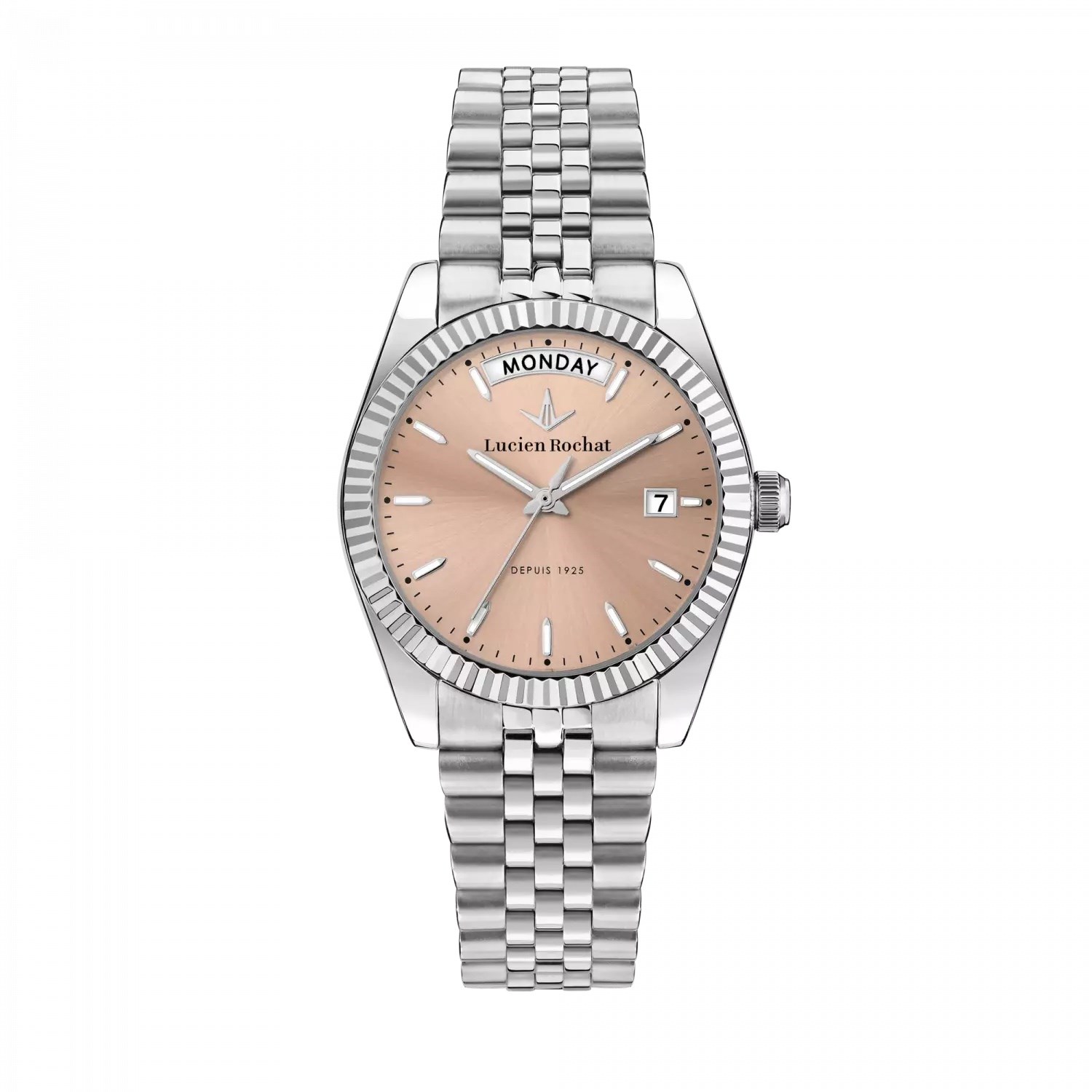 Orologio donna lucien rochat, R0453124508, collezione bienne, movimento al quarzo, solo tempo, cassa in acciaio 35mm, quadrante rosa con datario, bracciale in acciaio, resistenza all'acqua 5atm