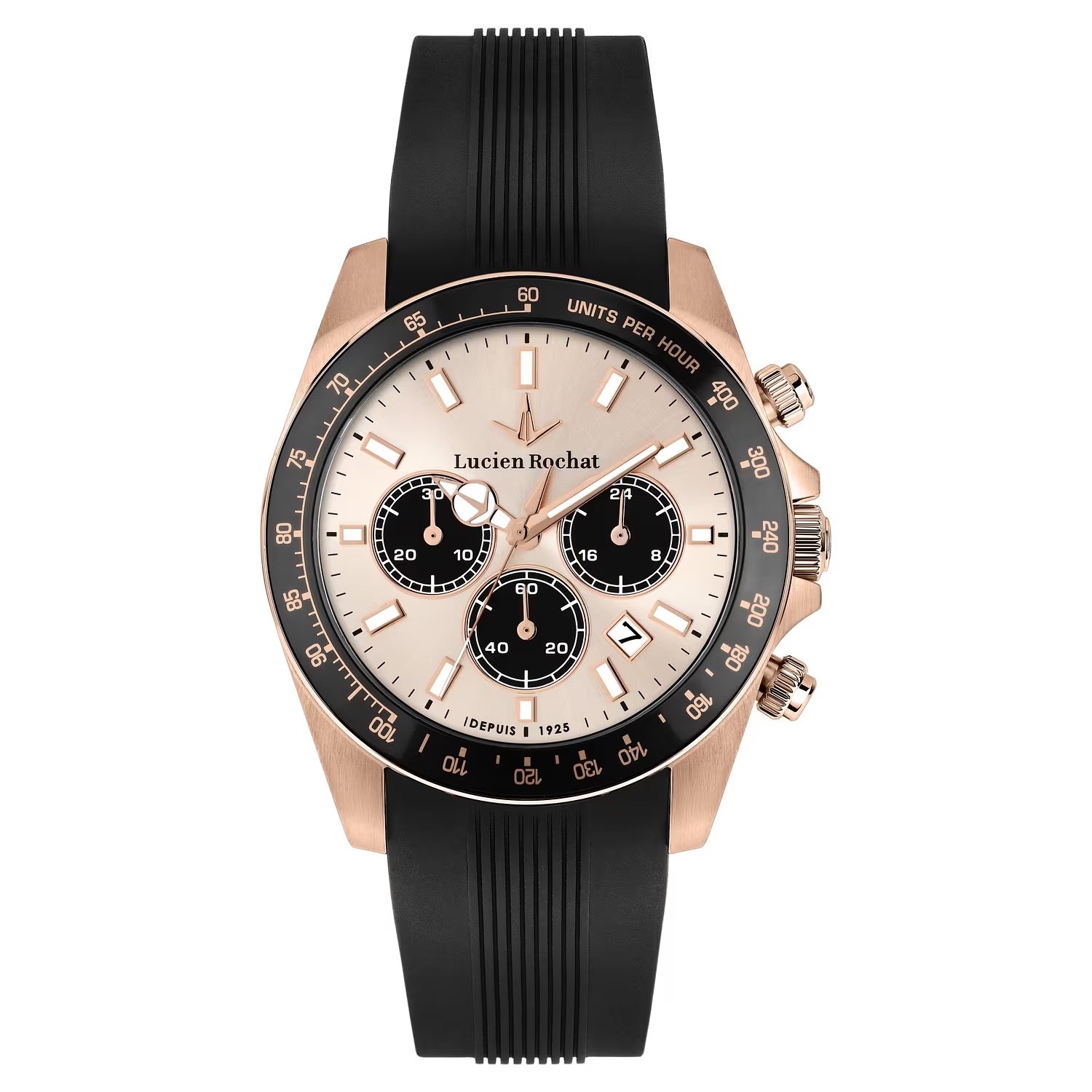 Orologio uomo lucien rochat, R0471617004, collezione lèman, movimento al quarzo, cronografo, cassa in acciaio rosa 41mm, quadrante oro rosa con datario, vetro trattamento zaffiro, fondello e corona a vite, cinturino in silicone, resistenza all'acqua 10atm