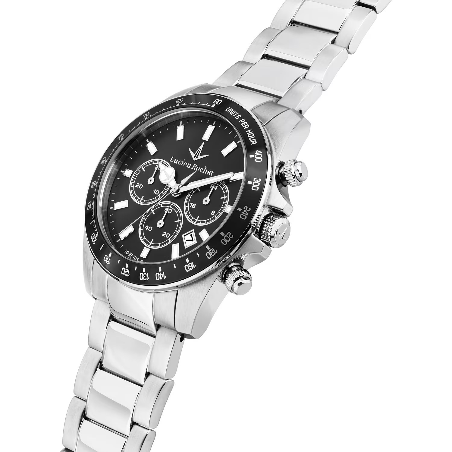 Orologio uomo lucien rochat, R0473617010, collezione lèman, movimento al quarzo, cronografo, cassa in acciaio 41mm, quadrante nero con datario, vetro trattamento zaffiro, fondello e corona a vite, bracciale in acciaio, resistenza all'acqua 10atm