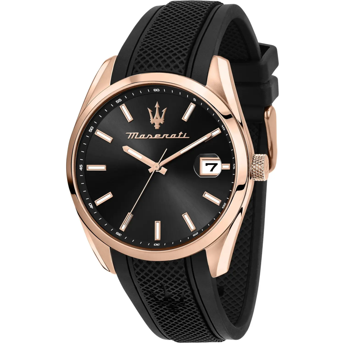 Orologio uomo maserati, R8851151002, collezione attrazione, movimento al quarzo, solo tempo, cassa in acciaio rosa 43mm, quadrante rosa con datario a bolla, cinturino in silicone, resistenza all'acqua 5atm
