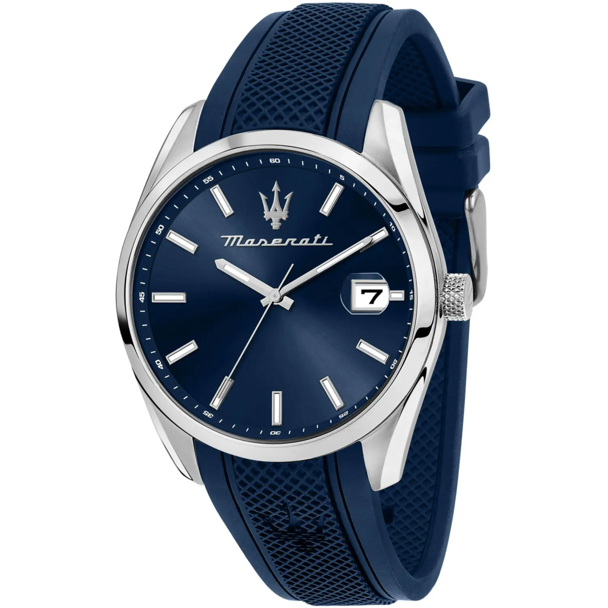 Orologio uomo maserati, R8851151005, collezione attrazione, movimento al quarzo, solo tempo, cassa in acciaio 43mm, quadrante blu con datario, cinturino in silicone, resistenza all'acqua 5atm