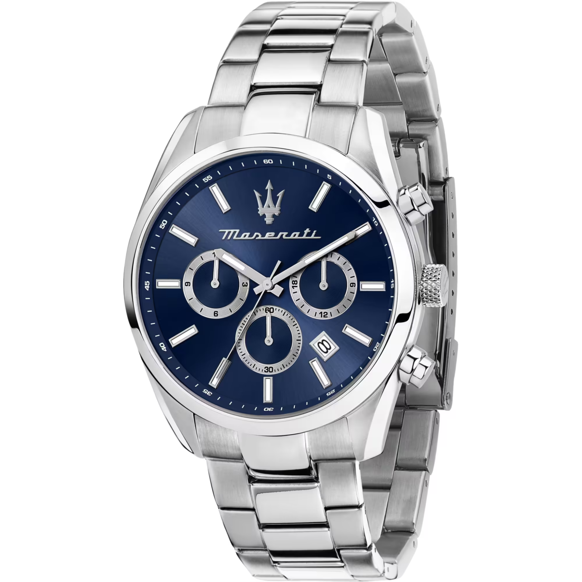 Orologio uomo maserati, R8853151005, collezione attrazione, movimento al quarzo, multifunzione, cassa in acciaio 43mm, quadrante blu con datario, bracciale in acciaio, resistenza all'acqua 5atm