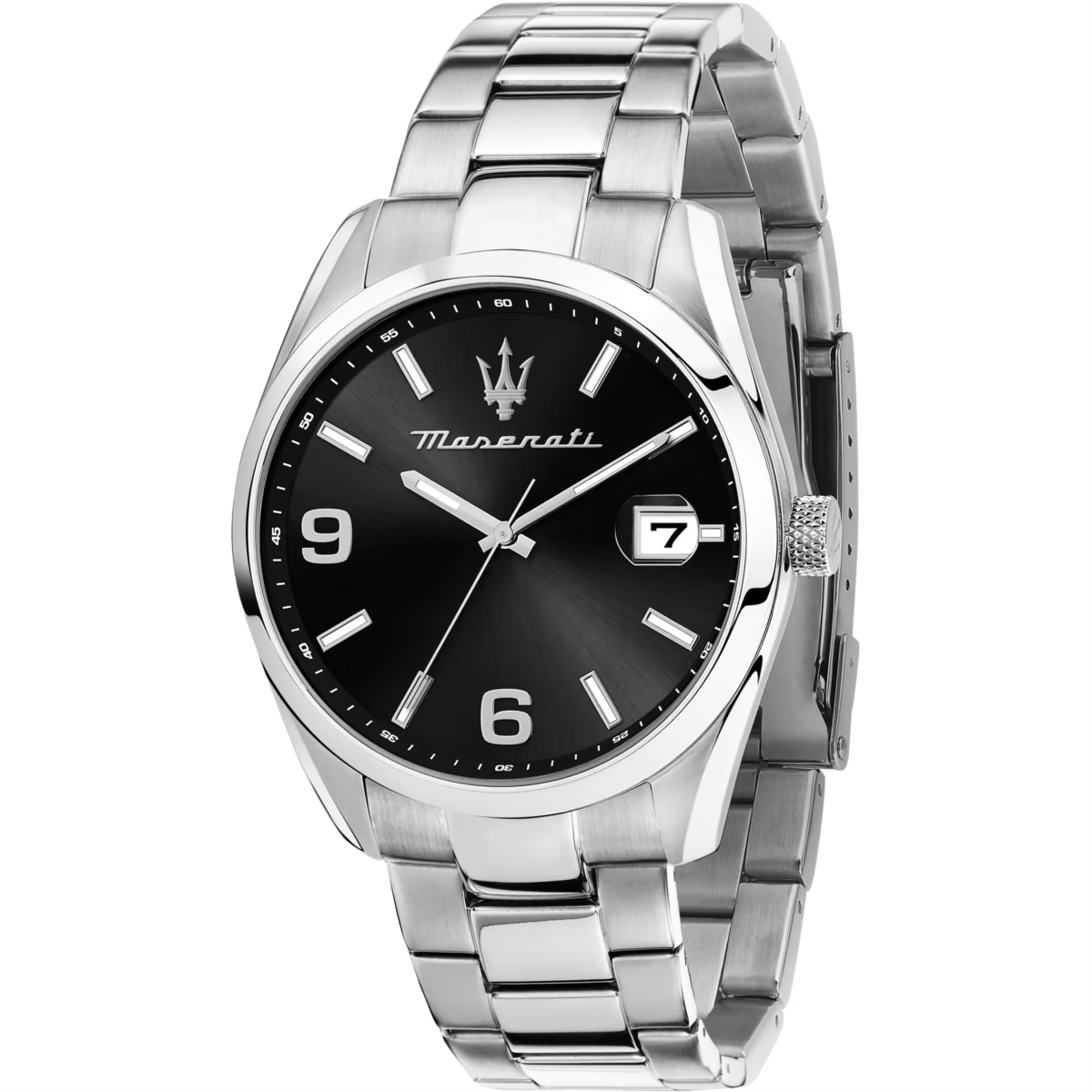 Orologio uomo maserari, R8853151007, collezione attrazione, movimento al quarzo, solo tempo, cassa in acciaio 43mm, quadrante nero con datario a bolla, bracciale in acciaio, resistenza all'acqua 5atm