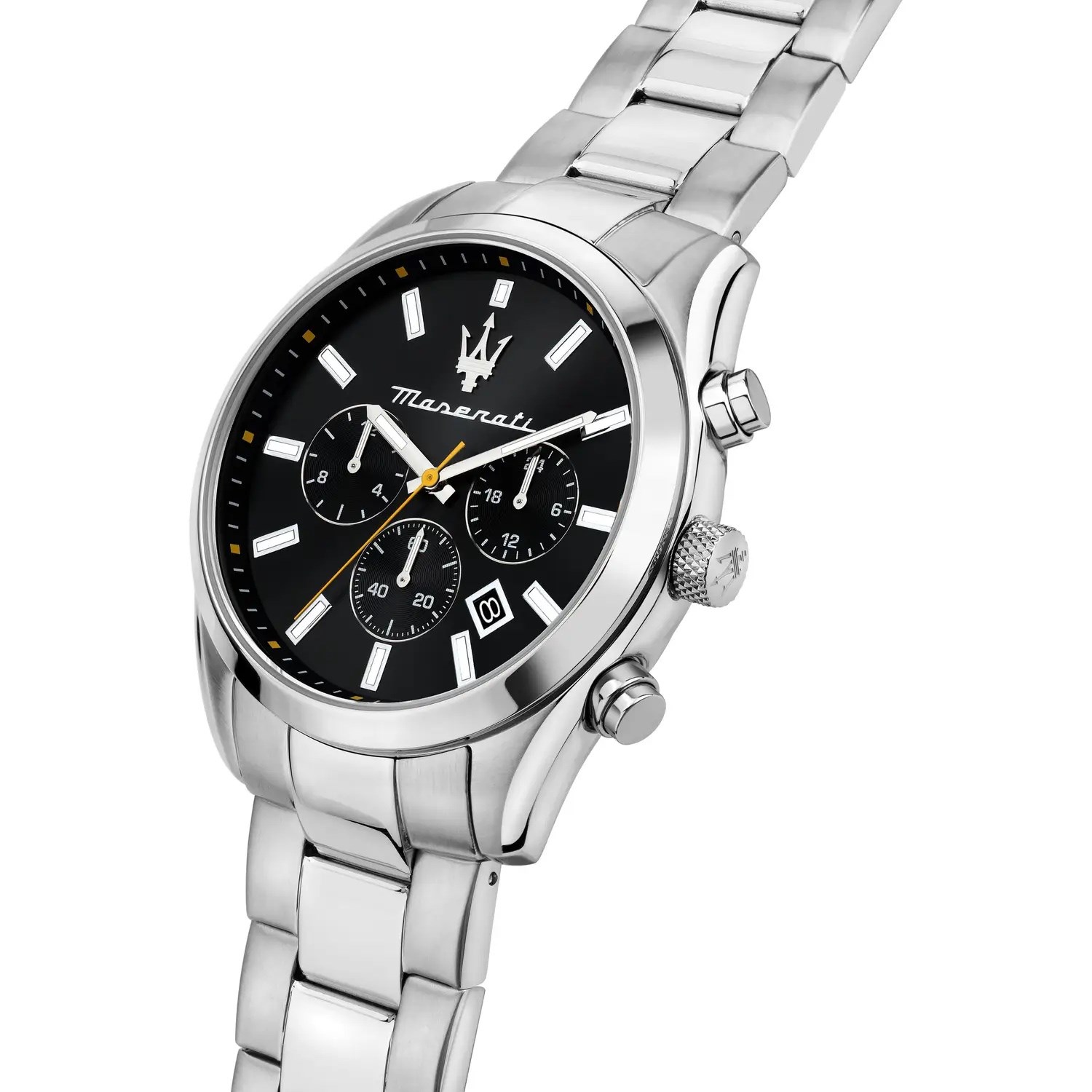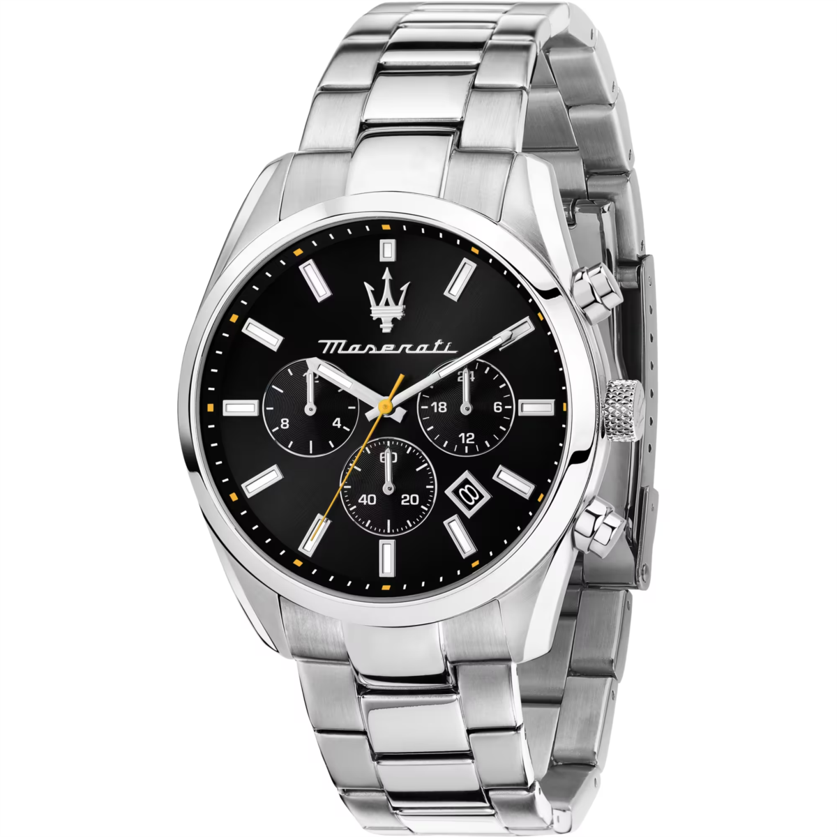 Orologio uomo maserati, R8853151010, collezione attrazione, movimento al quarzo, cronografo, cassa in acciaio 43mm, quadrante nero con datario, bracciale in acciaio, resistenza all'acqua 5atm