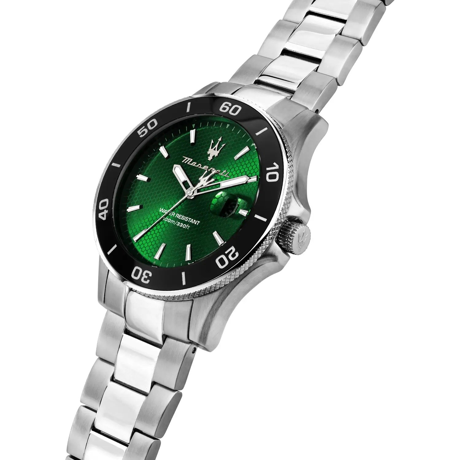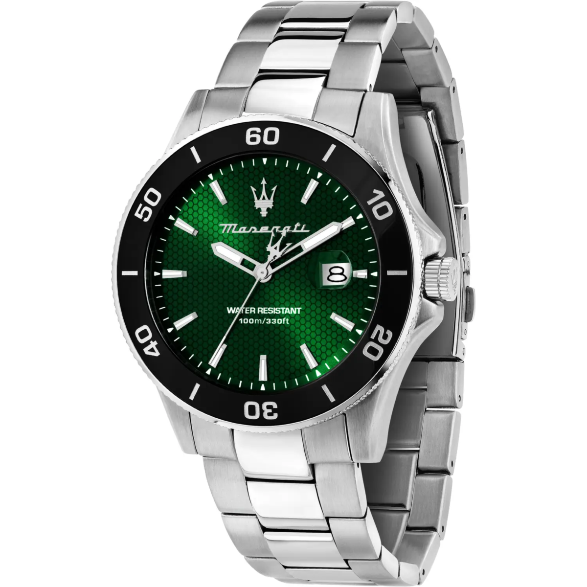 Orologio uomo maserati, R8853100038, collezione competizione, movimento al quarzo, solo tempo, cassa in acciaio 43mm, quadrante verde con datario a bolla, lunetta in ceramica nera, fondello e corona a vite, bracciale in acciaio, resistenza all'acqua 10atm