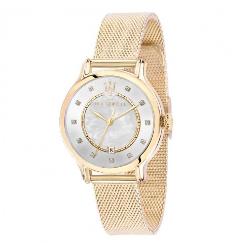 Orologio donna Maserati, R8853118512, collezione Epoca, movimento al quarzo, solo tempo, cassa in acciaio dorato 34Mm, quadrante madreperla con datario, cinturino in maglia Milano dorato, resistenza all'acqua 10atm