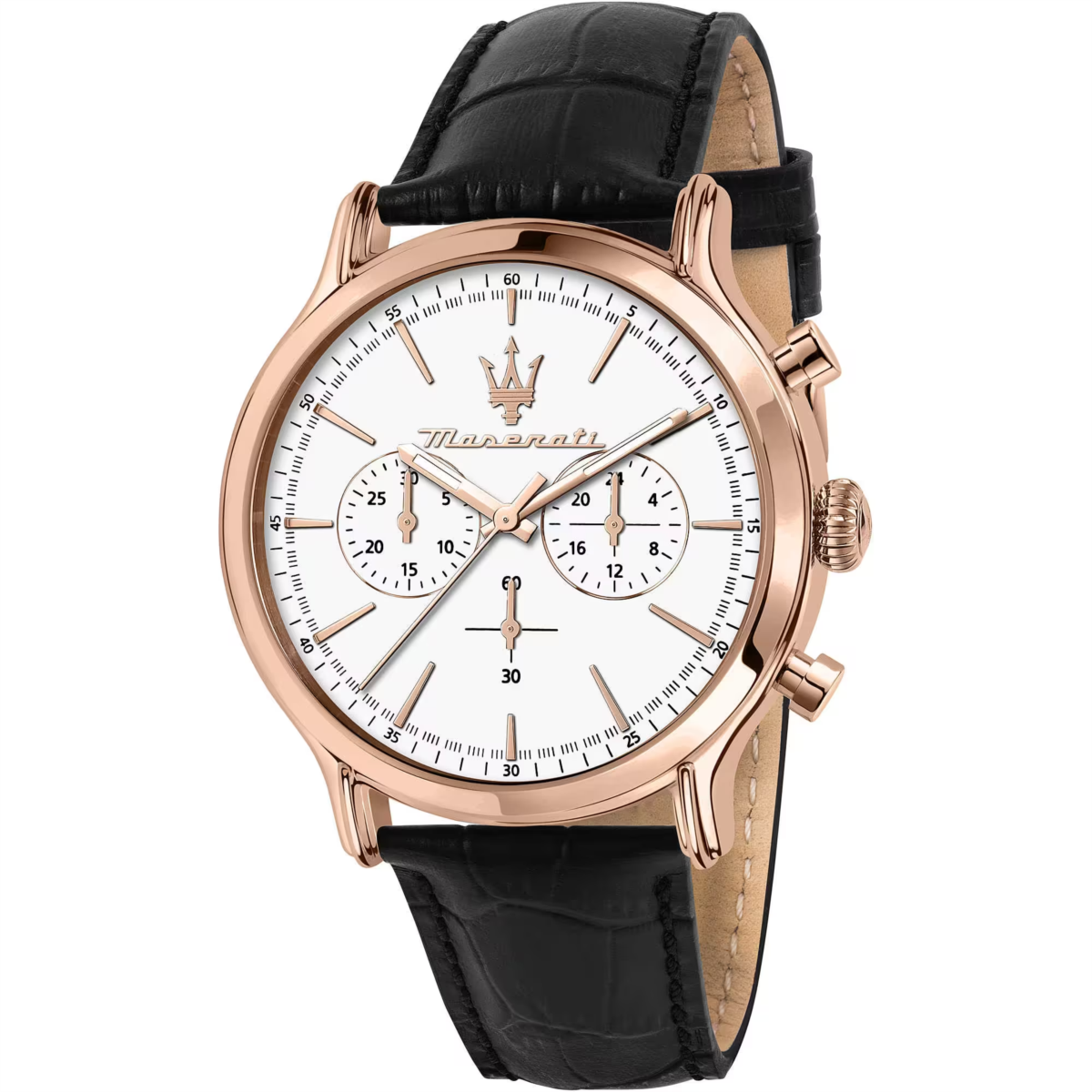 Orologio uomo maserati, R8871618016, collezione epoca, movimento al quarzo, cronografo, cassa in acciaio rosa 42mm, quadrante bianco, Fondello e corona a vite, cinturino in pelle, resistenza all'acqua 10atm