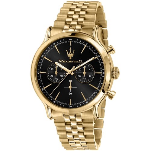 Orologio uomo maserati, R8873618023, collezione epoca, movimento al quarzo, cronografo, cassa in acciaio dorato 42mm, quadrante nero, bracciale in acciaio dorato, resistenza all'acqua 10atm