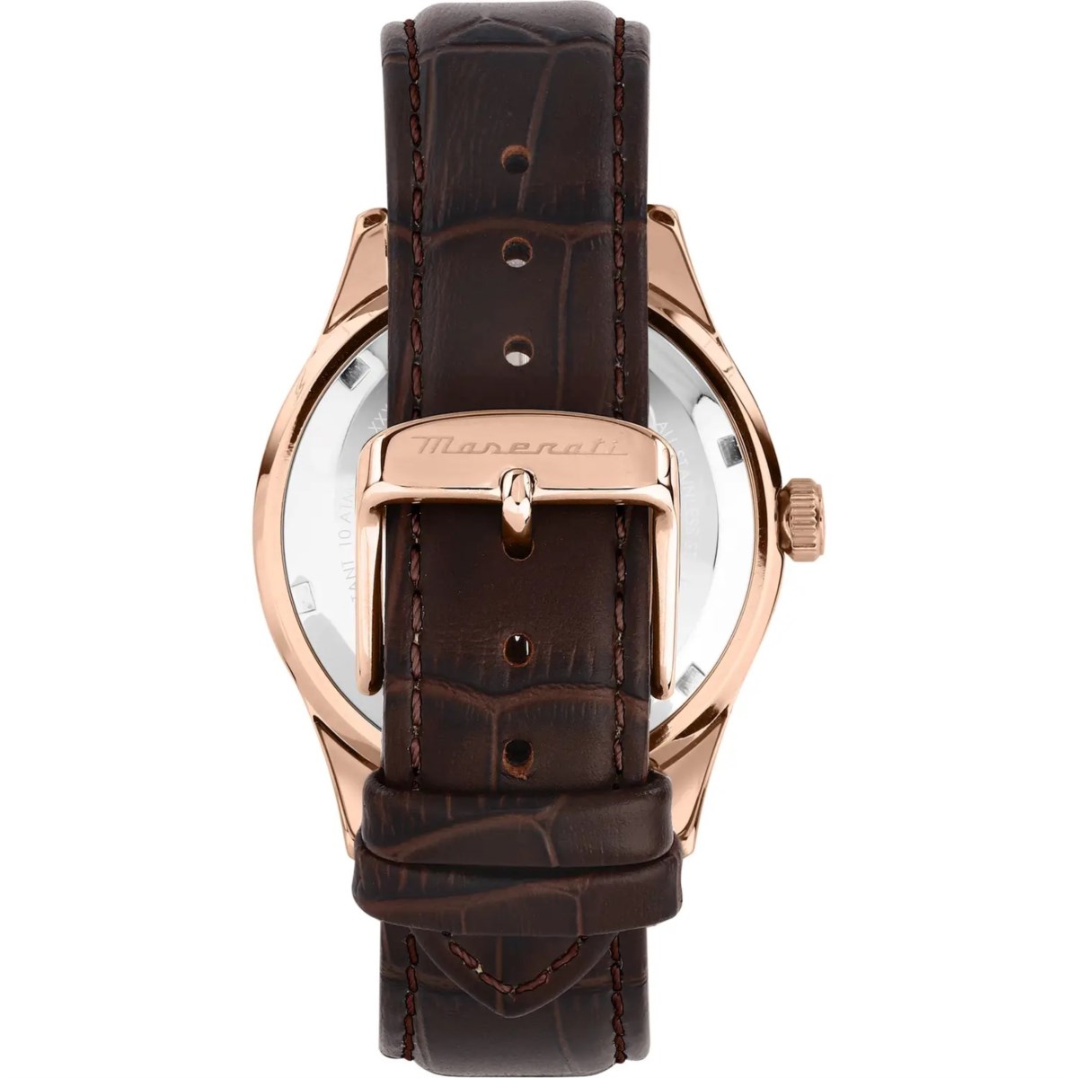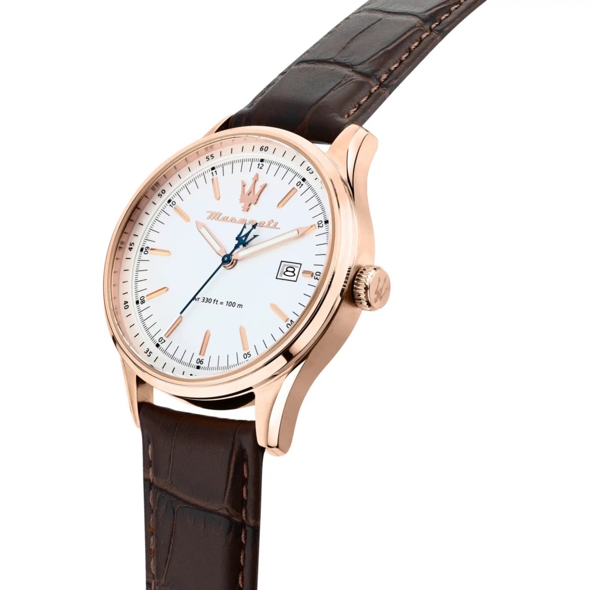 Orologio uomo maserati, R8851124002, collezione sorpasso, movimento al quarzo, solo tempo, cassa in acciaio rosa 42mm, quadrante bianco con datario, fondello e corona a vite, cinturino in pelle, resistenza all'acqua 10atm