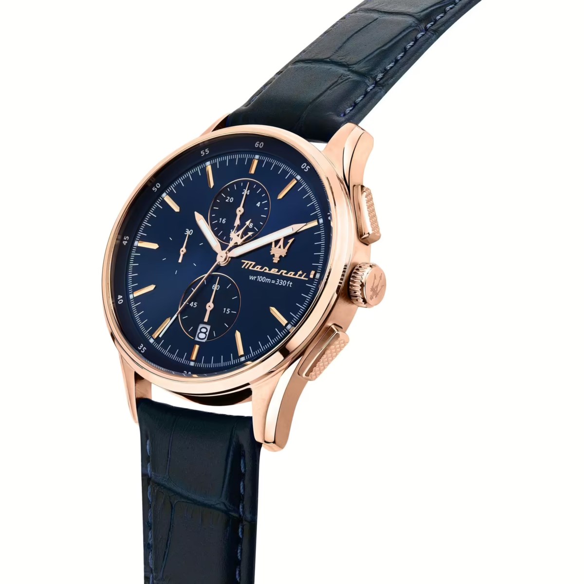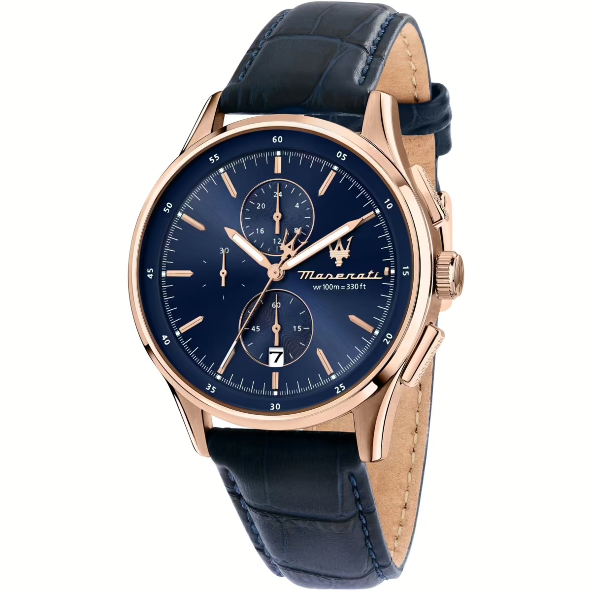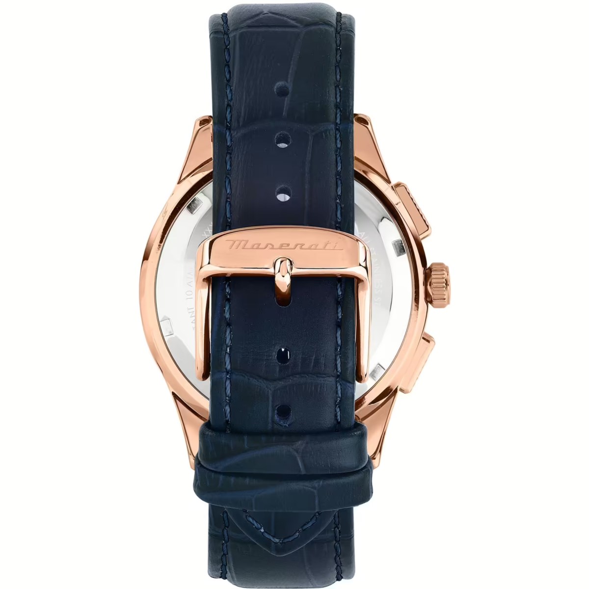 Orologio uomo maserati, R8871624009, collezione sorpasso, movimento al quarzo, cronografo, cassa in acciaio rosa 42mm, quadrante blu con datario, fondello e corona a vite, cinturino in pelle, resistenza all'acqua 10atm