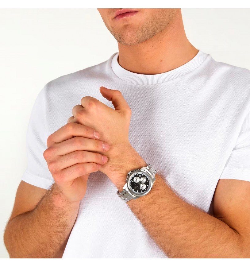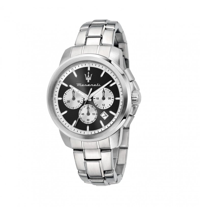 Orologio uomo maserati, R8873621052, collezione successo, movimento al quarzo, cronografo, cassa in acciaio 42mm, quadrante nero con datario, cinturino in acciaio. Resistenza all'acqua 5atm.
