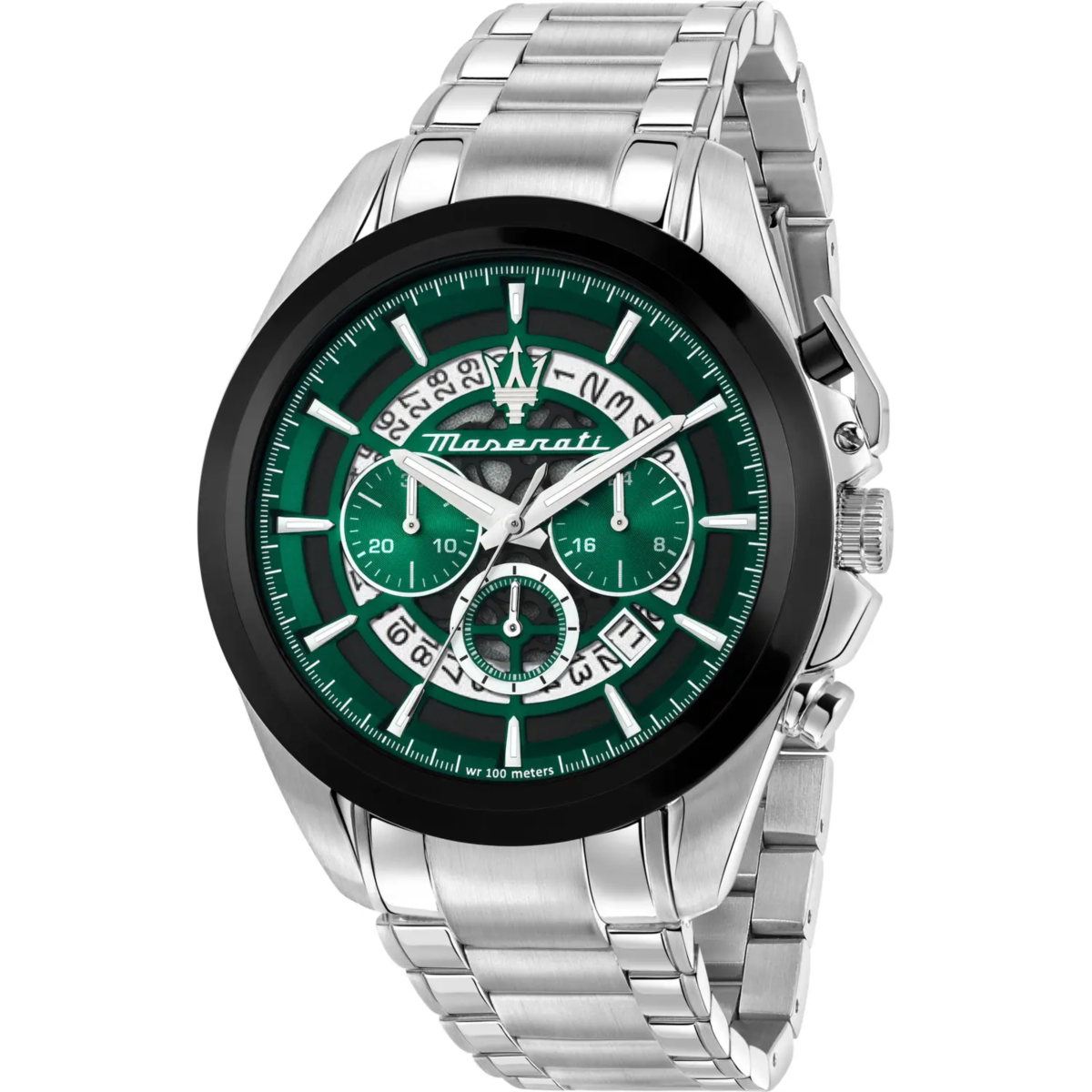 Orologio uomo maserati, R8873612060, collezione traguardo, movimento al quarzo, cronografo, cassa in acciaio 45mm, quadrante verde con datario, fondello e corona a vite, bracciale in acciaio, resistenza all'acqua 10atm