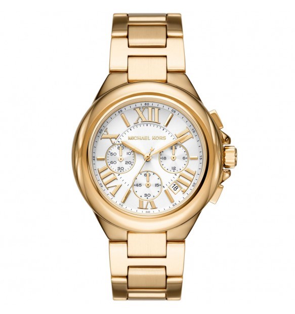 Orologio unisex michael kors, Mk7270, collezione camille, movimento al quarzo, cronografo, cassa in acciaio dorato 43mm, quadrante bianco con datario, bracciale in acciaio dorato, resistenza all'acqua 5atm