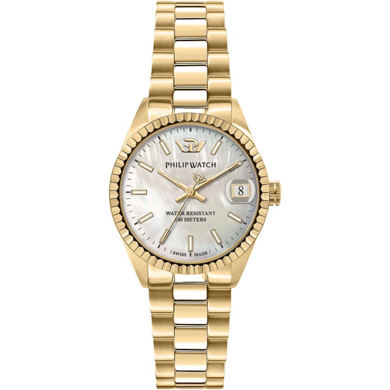 Orologio donna philip watch, R8253597579, collezione caribe, movimento al quarzo, solo tempo, cassa in acciaio dorato 31mm, quadrante madreperla con datario a bolla, bracciale in acciaio dorato, resistenza all'acqua 10atm