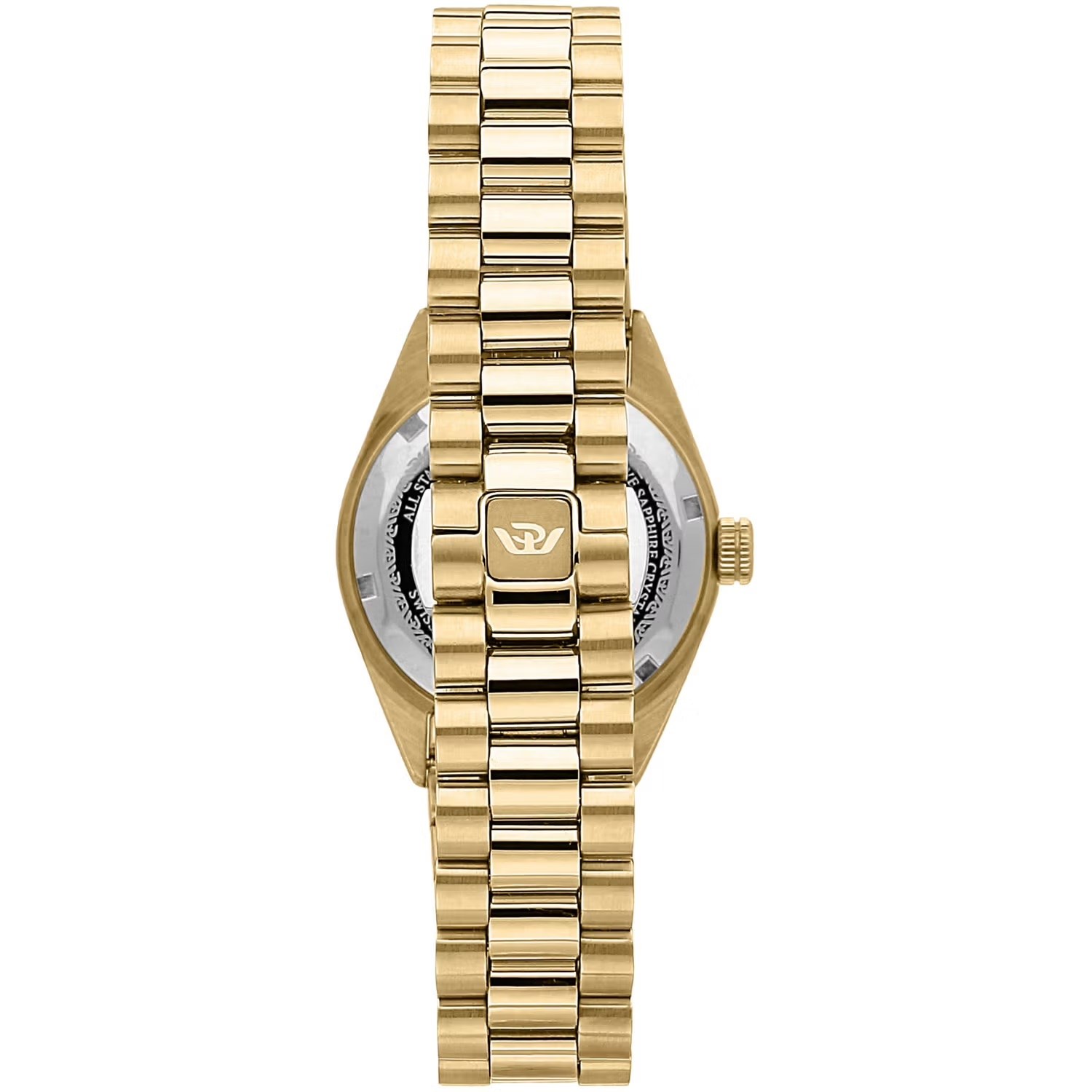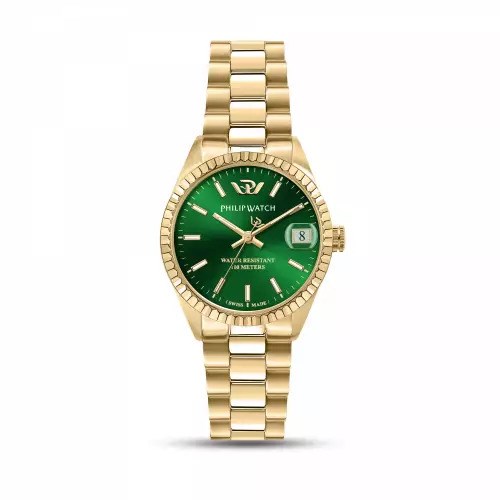Orologio donna philip watch, R8253597591, collezione caribe, movimento al quarzo, solo tempo, cassa in acciaio dorato 31mm, quadrante verde con datario a bolla, bracciale in metallo dorato, resistenza all'acqua 10atm