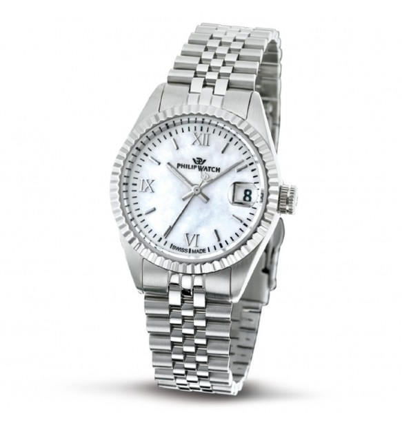 Orologio donna philip watch, R8253597592, collezione caribe urban, movimento al quarzo, solo tempo, cassa in acciaio 31mm, quadrante madreperla con datario a bolla, bracciale in acciaio, resistenza all'acqua 10atm