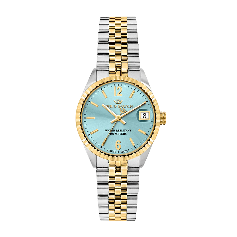 Orologio donna philip watch, R8253597662, collezione caribe urban, movimento al quarzo, solo tempo, cassa in acciaio 31mm, quadrante azzurro con datario a bolla, vetro zaffiro, fondello e corona a vite, bracciale in acciaio, resistenza all'acqua 10atm