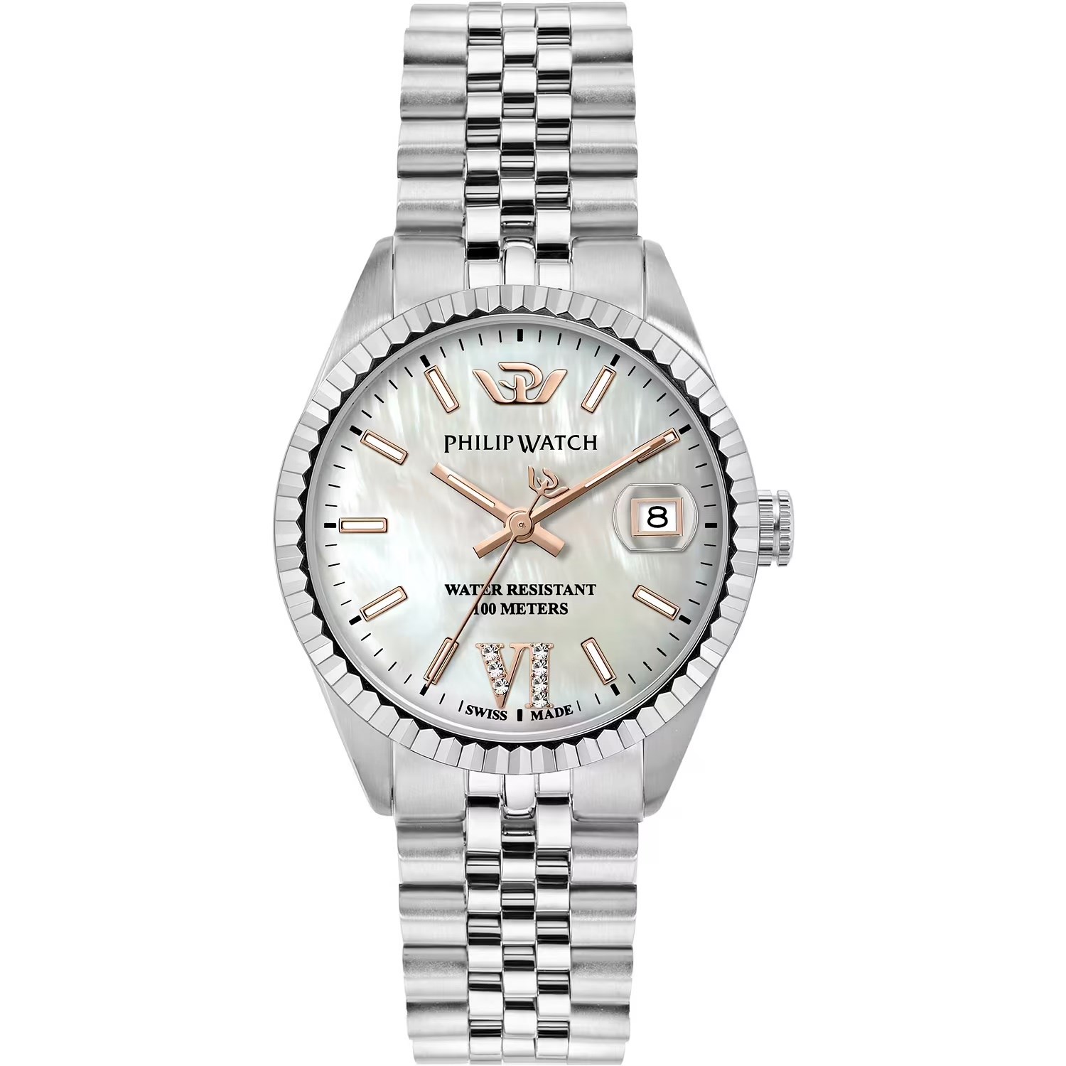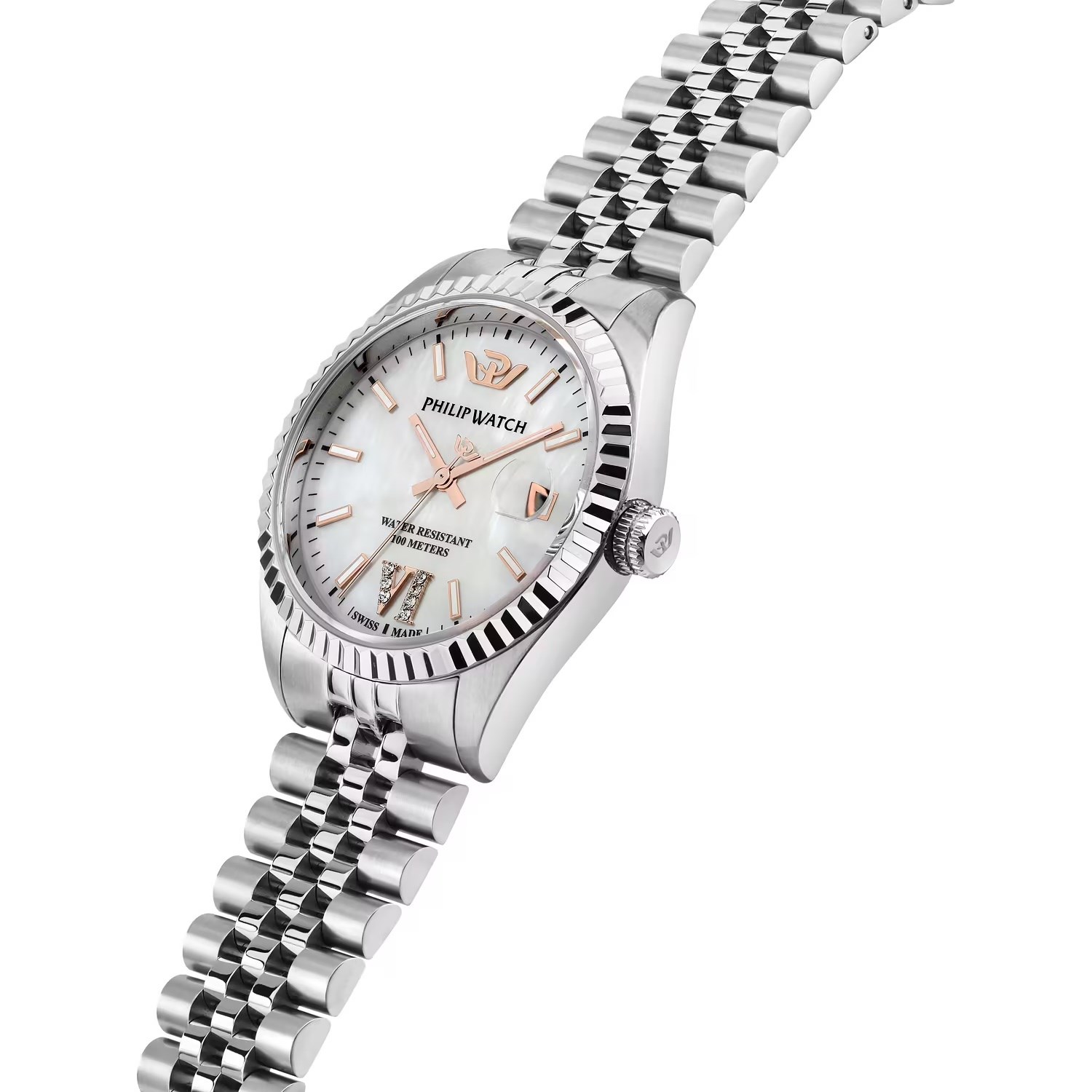 Orologio donna philip watch, R8253597672, collezione caribe urban, movimento al quarzo, solo tempo, cassa in acciaio 35mm, quadrante madreperla con datario a bolla, Vetro zaffiro, Fondello e corona a vite, Indici con diamanti, bracciale in acciaio, resistenza all'acqua 10atm