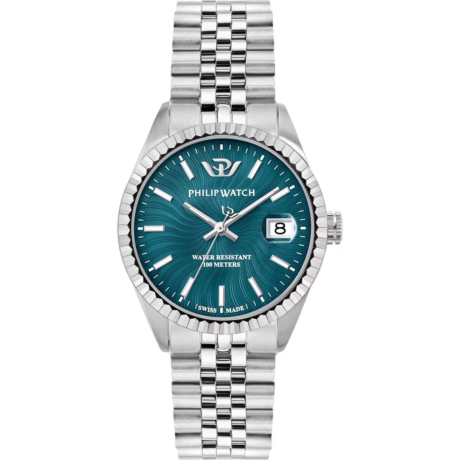 Orologio donna philip watch, R8253597681, collezione caribe urban, movimento al quarzo, solo tempo, cassa in acciaio 35mm, quadrante verde petrolio con datario a bolla, vetro zaffiro, fondello e corona a vite, bracciale in acciaio, resistenza all'acqua 10atm