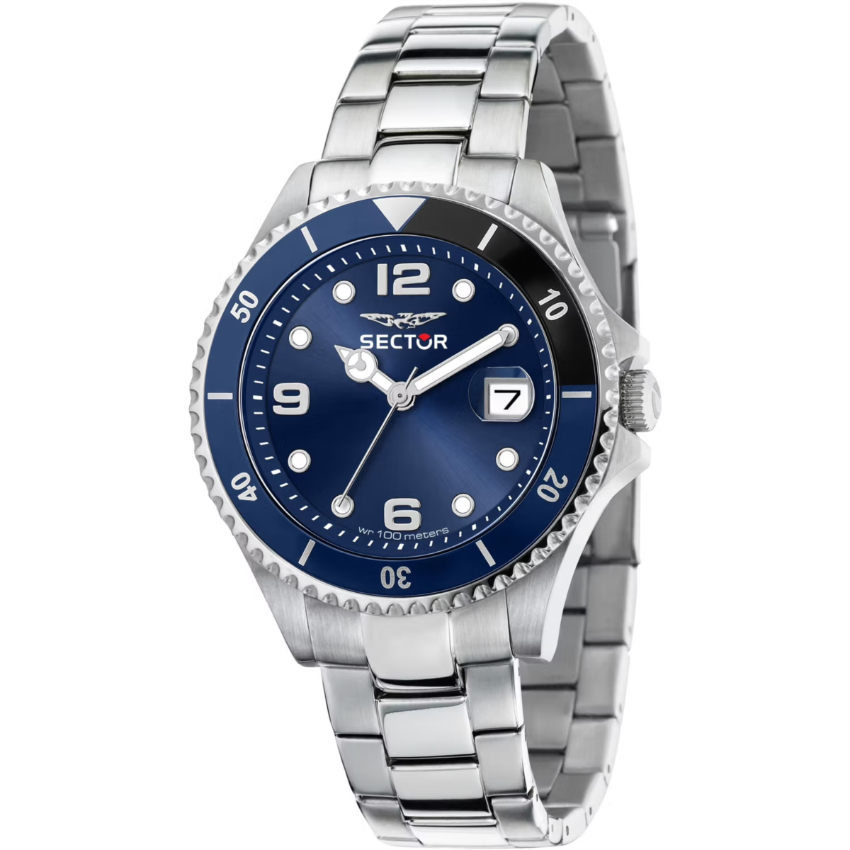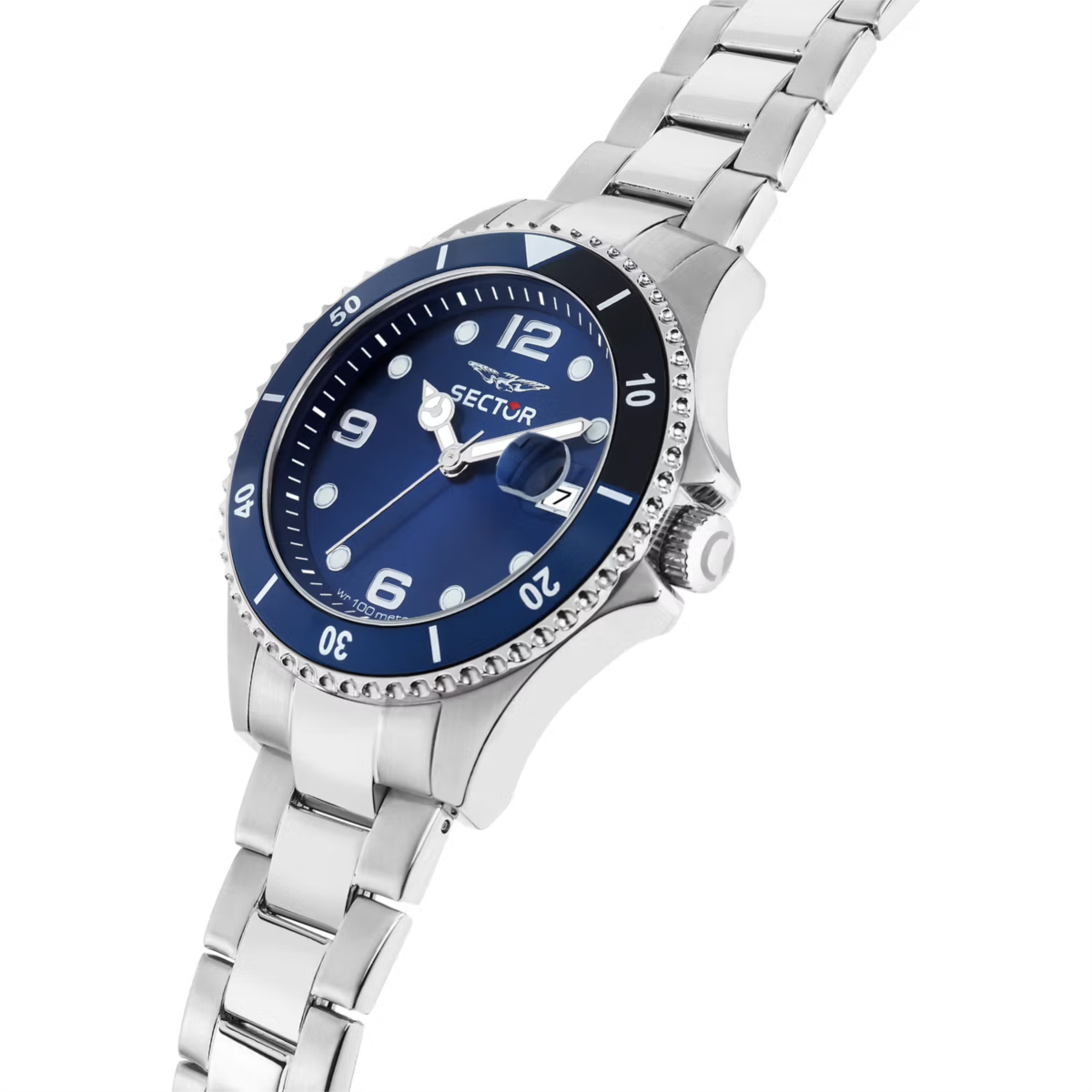 Orologio uomo sector, R3253161049, collezione 230, movimento al quarzo, solo tempo, cassa in acciaio 39mm, quadrante blu con datario, vetro minerale, lunetta in alluminio, bracciale in acciaio, resistenza all'acqua 10atm