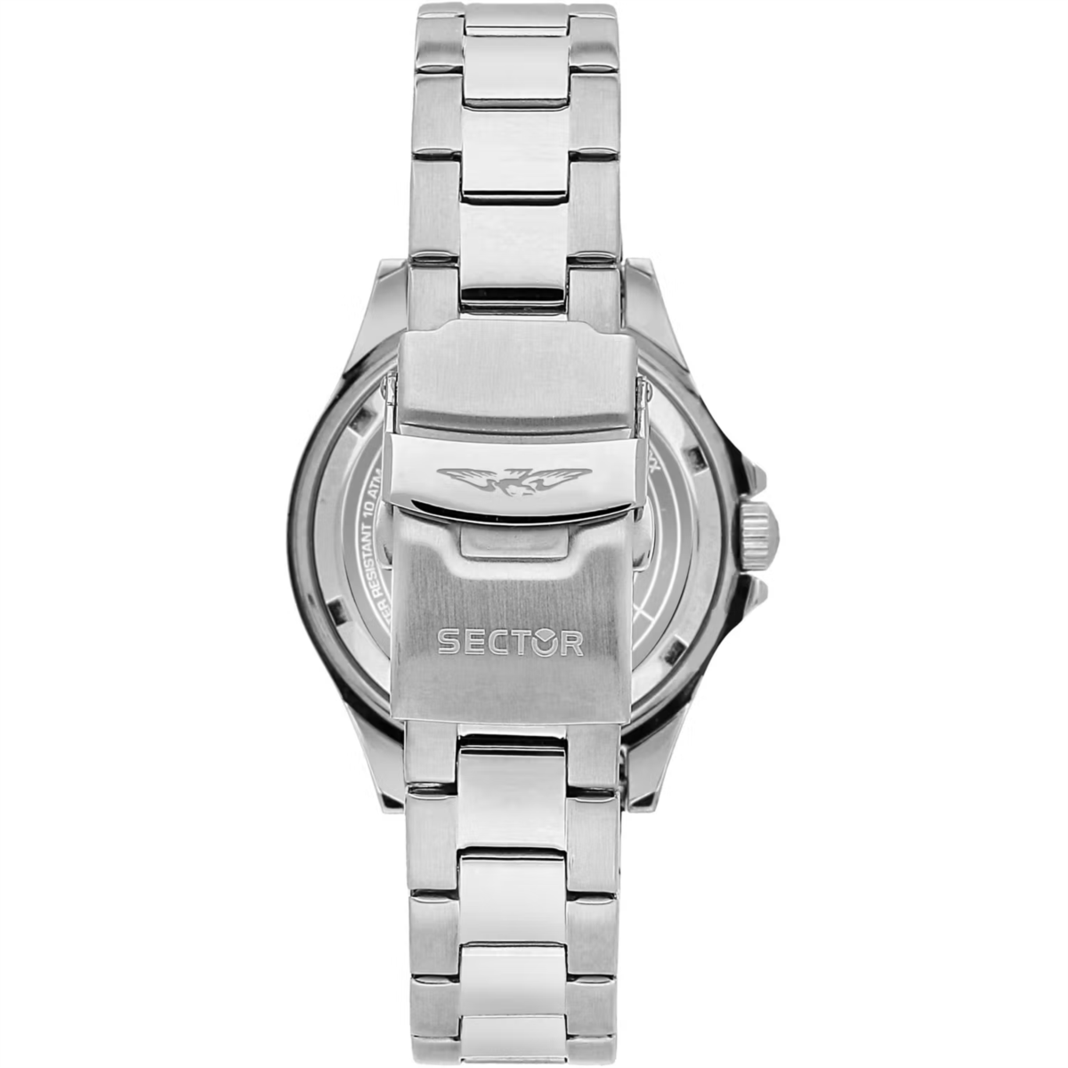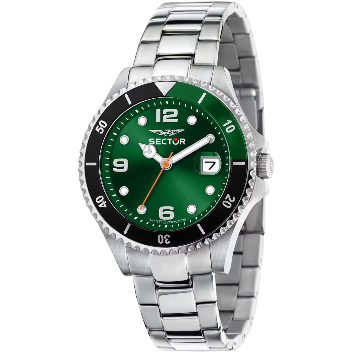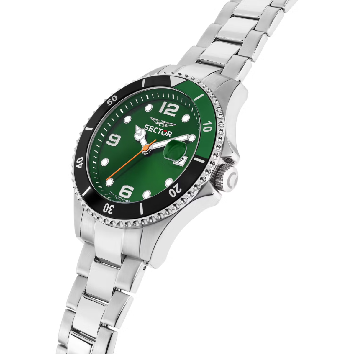 Orologio uomo sector, R3253161050, collezione 230, movimento al quarzo, solo tempo, cassa in acciaio 39mm, quadrante verde con datario a bolla, vetro minerale, lunetta in alluminio, bracciale in acciaio, resistenza all'acqua 10atm