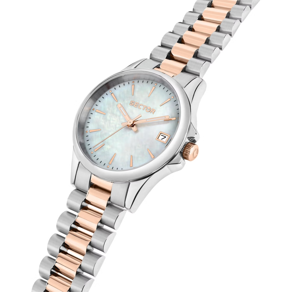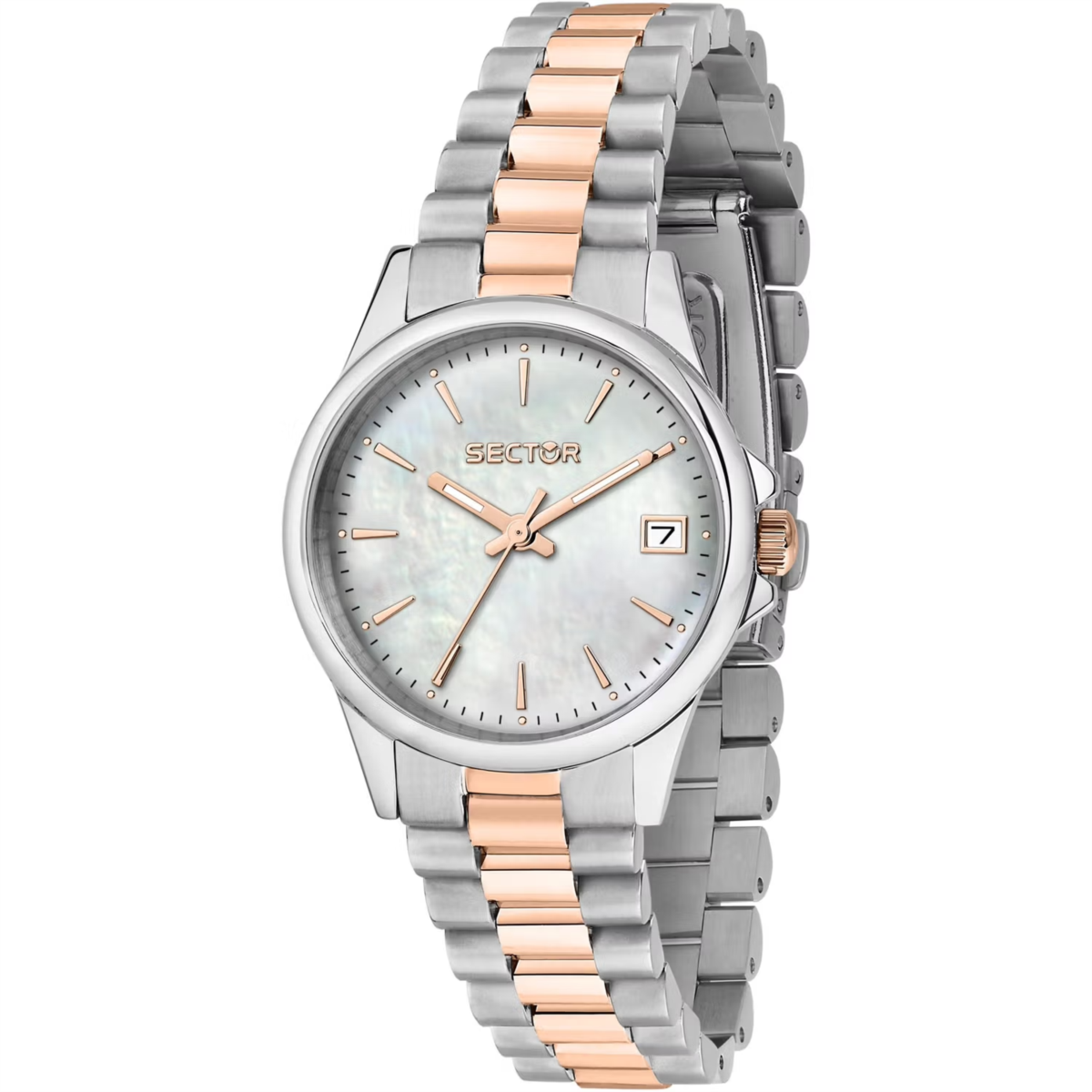 Orologio donna sector, R3253161539, collezione 230, movimento al quarzo, solo tempo, cassa in acciaio 32mm, quadrante madreperla con datario, vetro minerale, bracciale in acciaio, resistenza all'acqua 5atm
