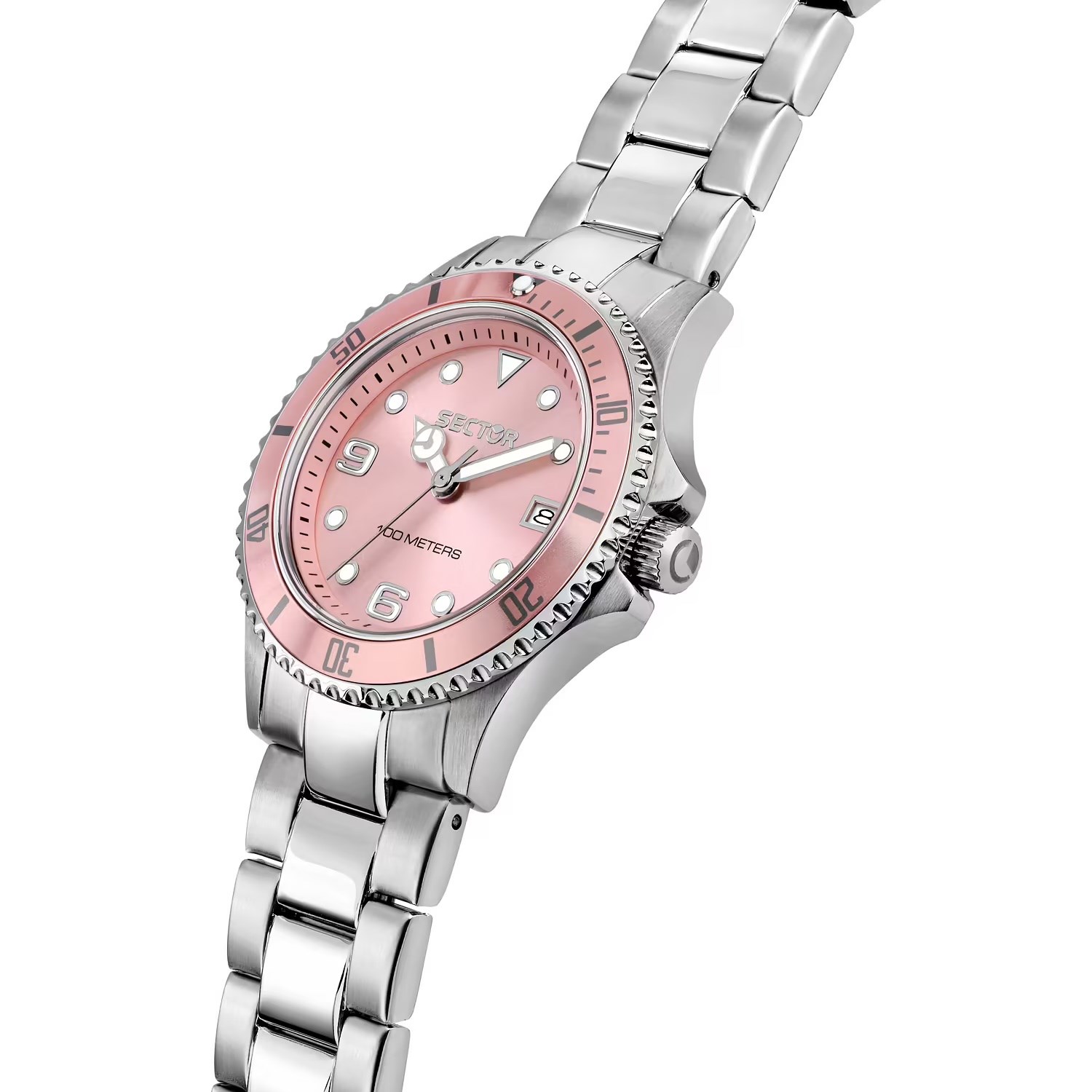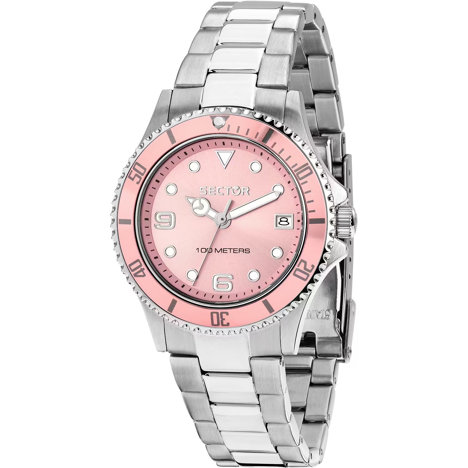 Orologio donna sector, R3253161551, collezione 230, movimento al quarzo, solo tempo, cassa in acciaio 35mm, quadrante rosa con datario, vetro minerale, fondello a vite, lunetta in alluminio, bracciale in acciaio, resistenza all'acqua 10atm