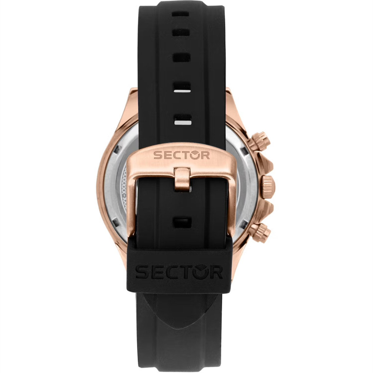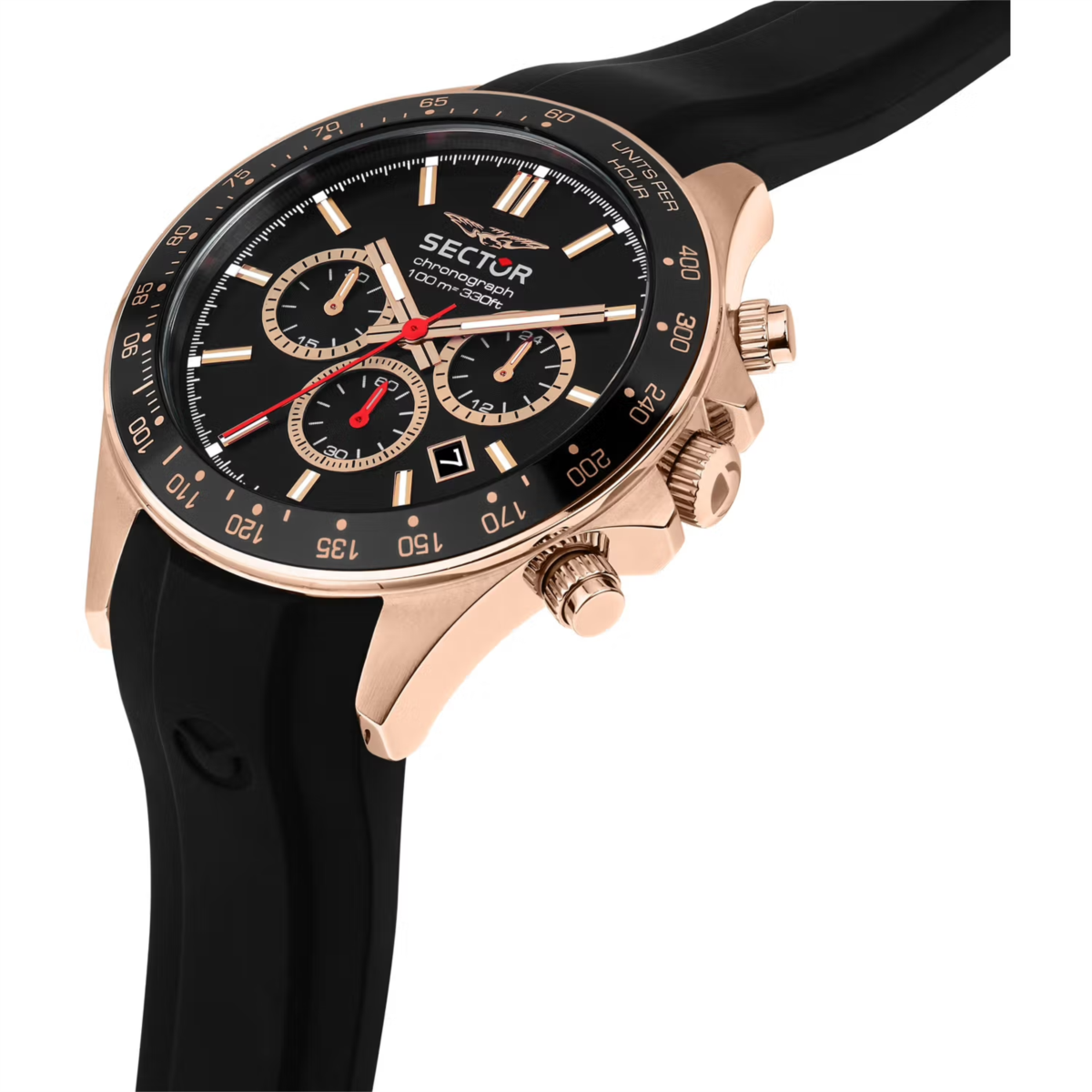 Orologio uomo sector, R3271661029, collezione 230, movimento al quarzo, cronografo, cassa in acciaio rosa 43mm, quadrante nero con datario, lunetta in alluminio, cinturino in silicone nero, resistenza all'acqua 10atm