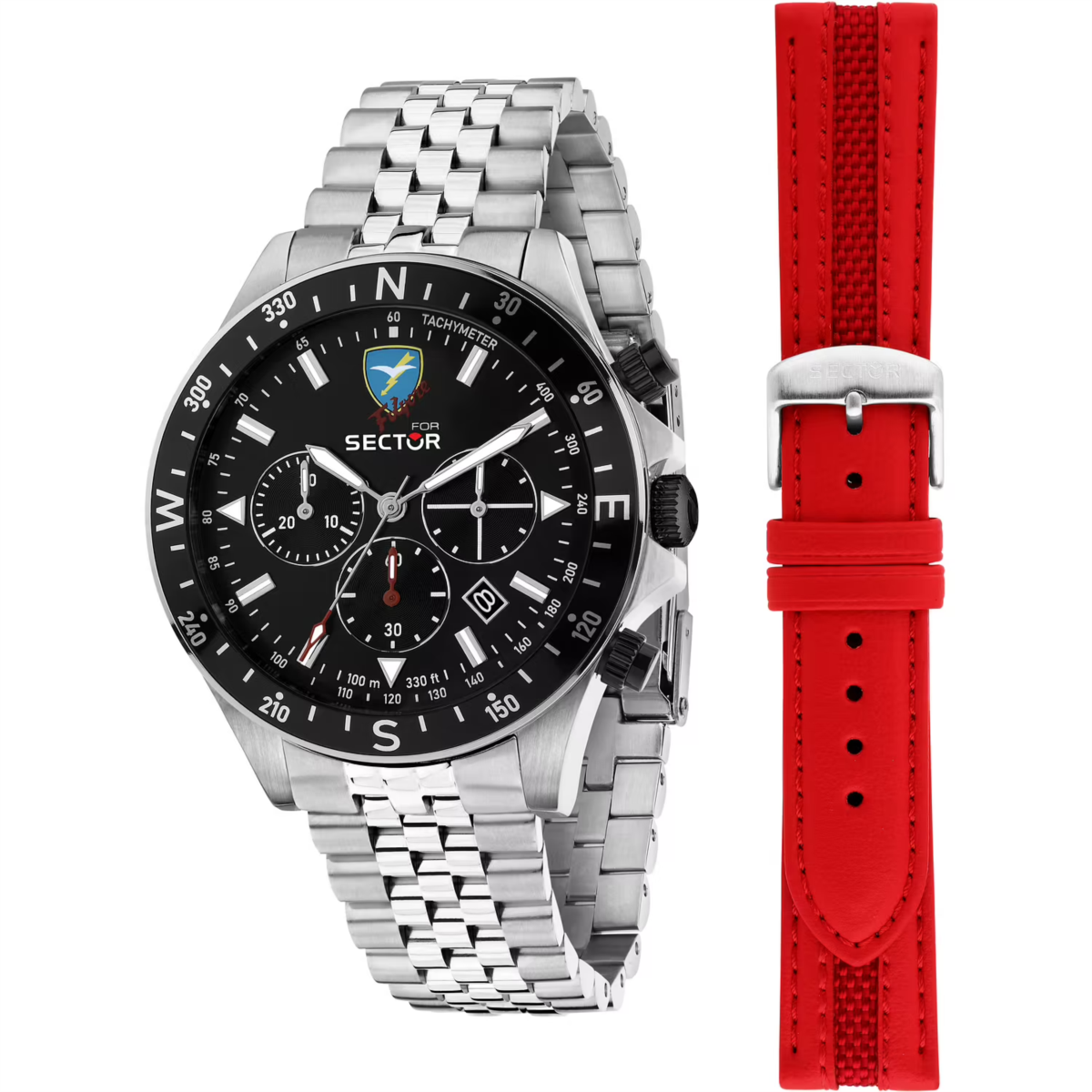 Orologio uomo sector, R3273161052, collezione 230, movimento al quarzo, cronografo, cassa in acciaio 43mm, quadrante nero con datario, bracciale in acciaio, resistenza all'acqua 10atm
