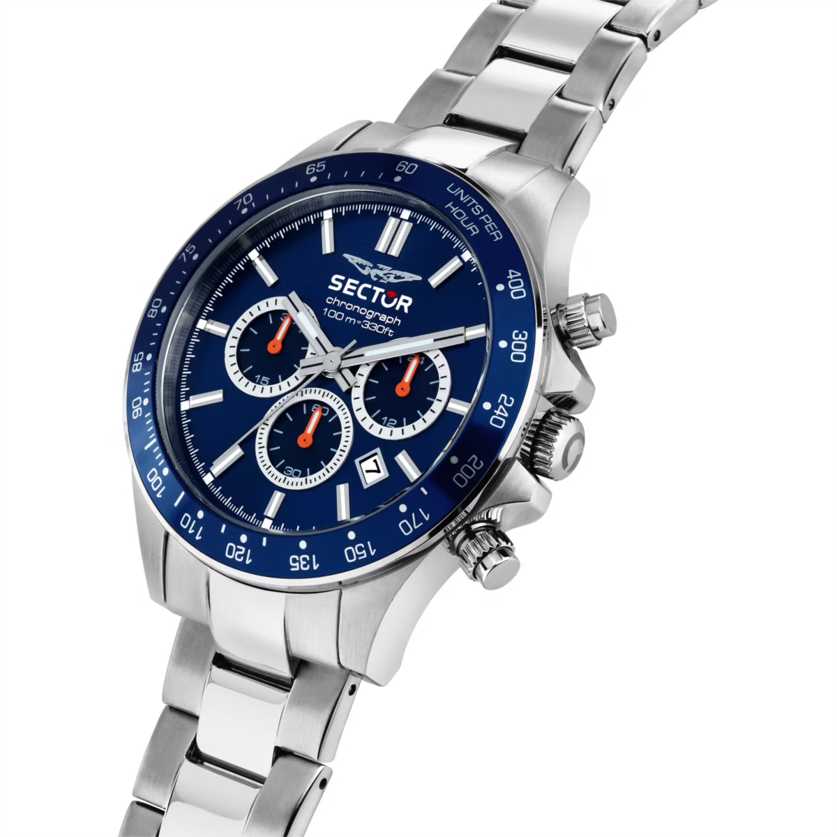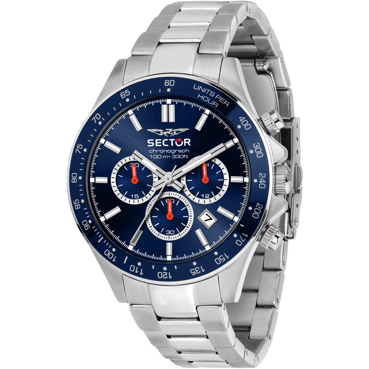 Orologio uomo sector, R3273661037, collezione 230, movimento al quarzo, cronografo, cassa in acciaio 43mm, quadrante blu con datario, vetro minerale, lunetta in alluminio, fondello a vite, bracciale in acciaio, resistenza all'acqua 10atm